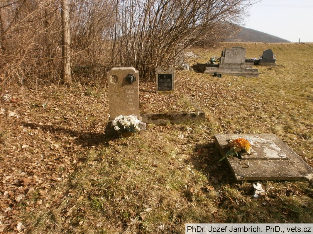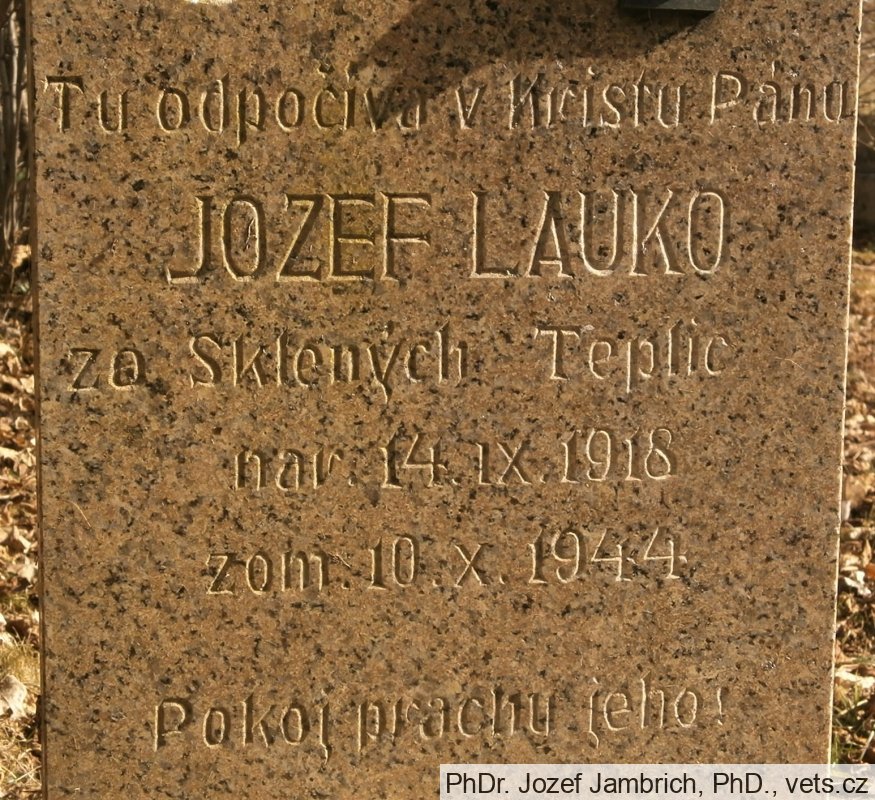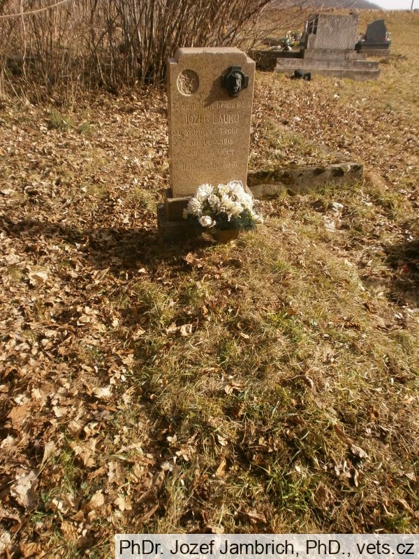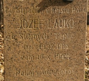 Jozef Lauko, rod. 14.9.1918, príslušník ozbrojených síl ČSR, dátum smrti 10.10.1944, 2. svetová vojna, reg. č. hrobu 51867100001, hrob na obecnom cintoríne, katolická časť, Ostrá Lúka.