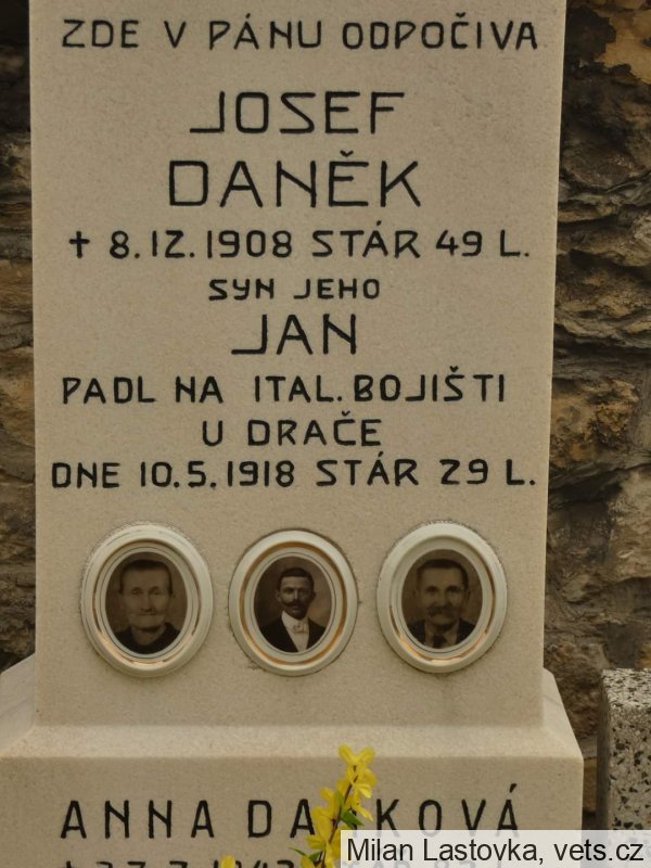Daněk Jan: *1889 Vračovice, okr. Vysoké Mýto (dnes okr. Ústí n/O.). Svobodný, hospodářský pomocník. Inft., IR. Nr. 98. Utonul při potopení lodi Bregenz v přístavu Drač (dnes Durrës v Albánii) 10.5.1918.