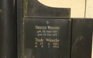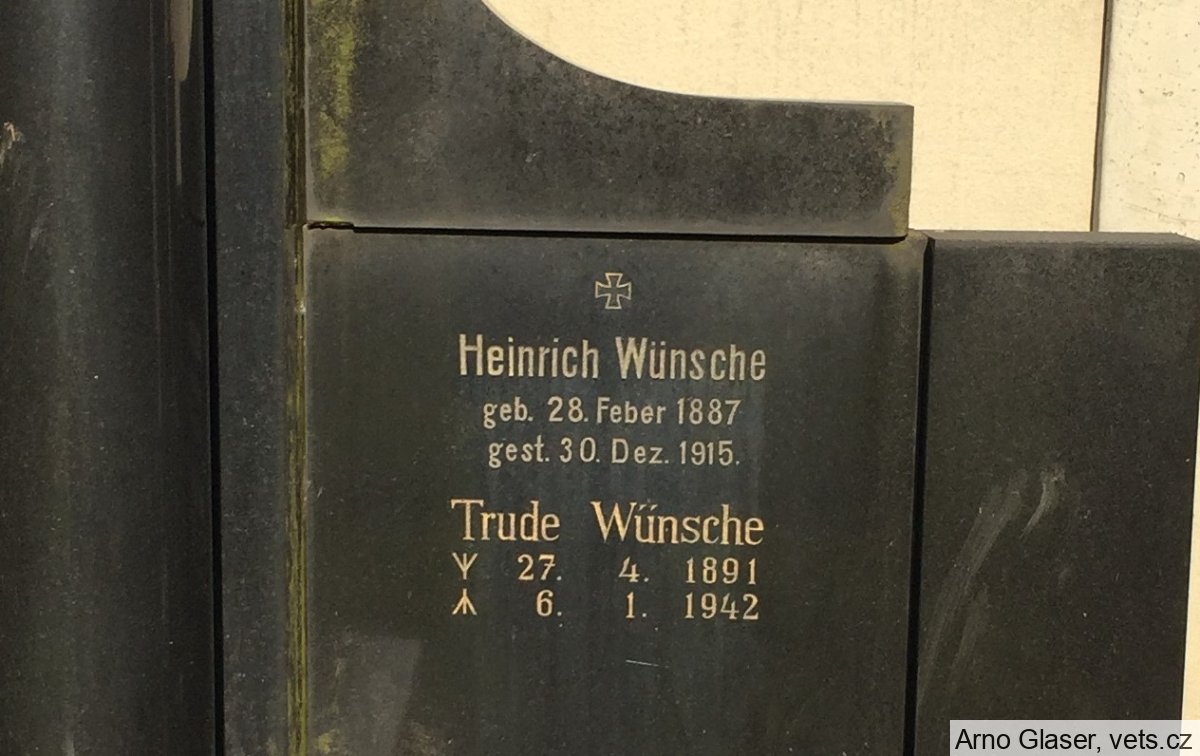 Wünsche Heinrich Friedrich: *28.2.1887 Groß Schönau, okr. Schluckenau (Velký Šenov, tehdy okr. Šluknov, dnes Děčín). Bydlištěm tamtéž, č. p. 423. Ženatý, dílovedoucí v továrně na knoflíky (otec byl majitelem). ResZugsf., titl. Feldw., IR. Nr. 42, 5. FeldKomp. +30.12.1915 Ebersbach, Sasko, Německo, na srdeční slabost během operace. Převezen a zde 2.1.1916 pohřben.