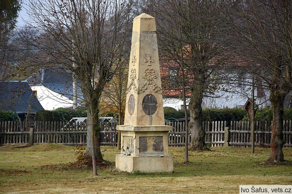 Již v létě 1914 byl na svátek Všech svatých vztyčen na místním hřbitově dřevěný kříž na památku prvních válečných obětí. Zásluhou místního velkoprůmyslníka Franze Josefa Müllera byl tento kříž v létě 1917 nahrazen obeliskem se symbolem tlapatého kříže a květinovými girlandami, na jejichž bocích byly osazeny čtyři oválné měděné desky s dedikačním nápisem a verši básníků Reinholda Samuelsohna a Karla Förstera. Později byly na sokl obelisku umístěny také měděné tabule se jmény 182 válečných obětí pořízené z peněžních darů za částku 16 tis. Kč. Takto upravený pomník byl odhalen opět o svatodušních svátcích 1. listopadu 1924.