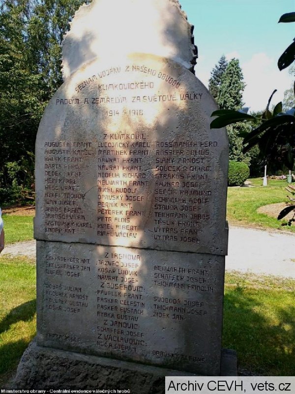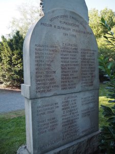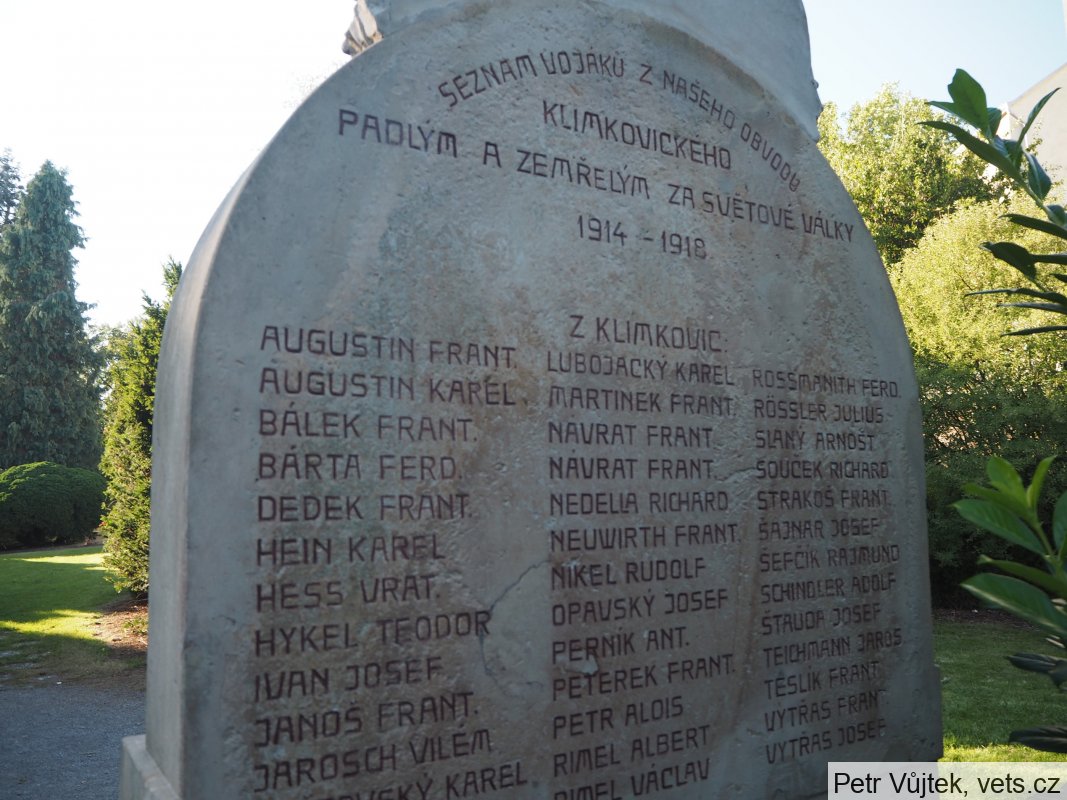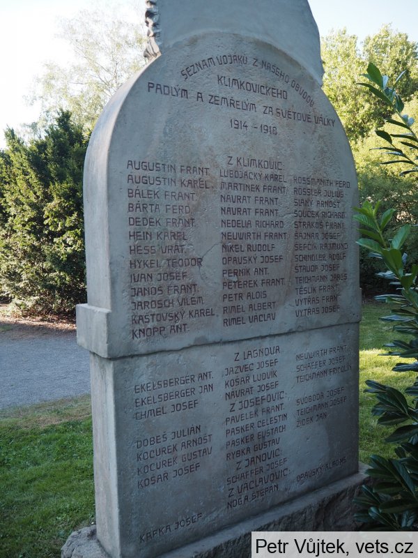 Umístění: Klimkovice, Lidická, Park Petra Bezruče, za kostelem Sv. Kateřiny1914 = OBĚTOVÁNÍM ŽIVOTŮ RODÍ SE ŽIVOT NÁRODA = 1918