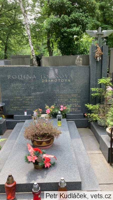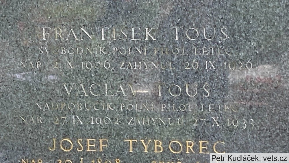 Pilot svob. FRANTIŠEK TOUŠ od LP2 zemřel dne 28.8.1926 při srážce letadel v blízkosti letiště Olomouc – Neředín (ve druhém letadle zemřel Václav Palek – jeho hrob je také na vets.cz). Datum úmrtí na náhrobku je chybně napsané (když o tom ve všech novinách psali o měsíc dřív). Pohřben byl v Brandýse n. L., později byly jeho ostatky exhumovány a převezeny do Prahy na Olšanské hřbitovy, kde byly pohřbeny dne 6.11.1945.