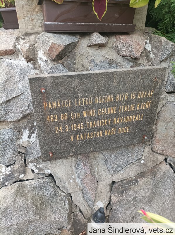 "letadlo letělo z letiště Cellone v Itálii. Patřilo k 15. letecké armádě, k 463. bombardovací skupině. V Berlíně bombardovalo továrnu na výrobu tankových motorů. Po zásahu protiletadlovou střelou v Krušných horách se celá posádka o 10 členech katapultovala. Měsíc byli v zajetí. Všichni přežili."