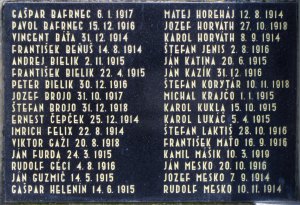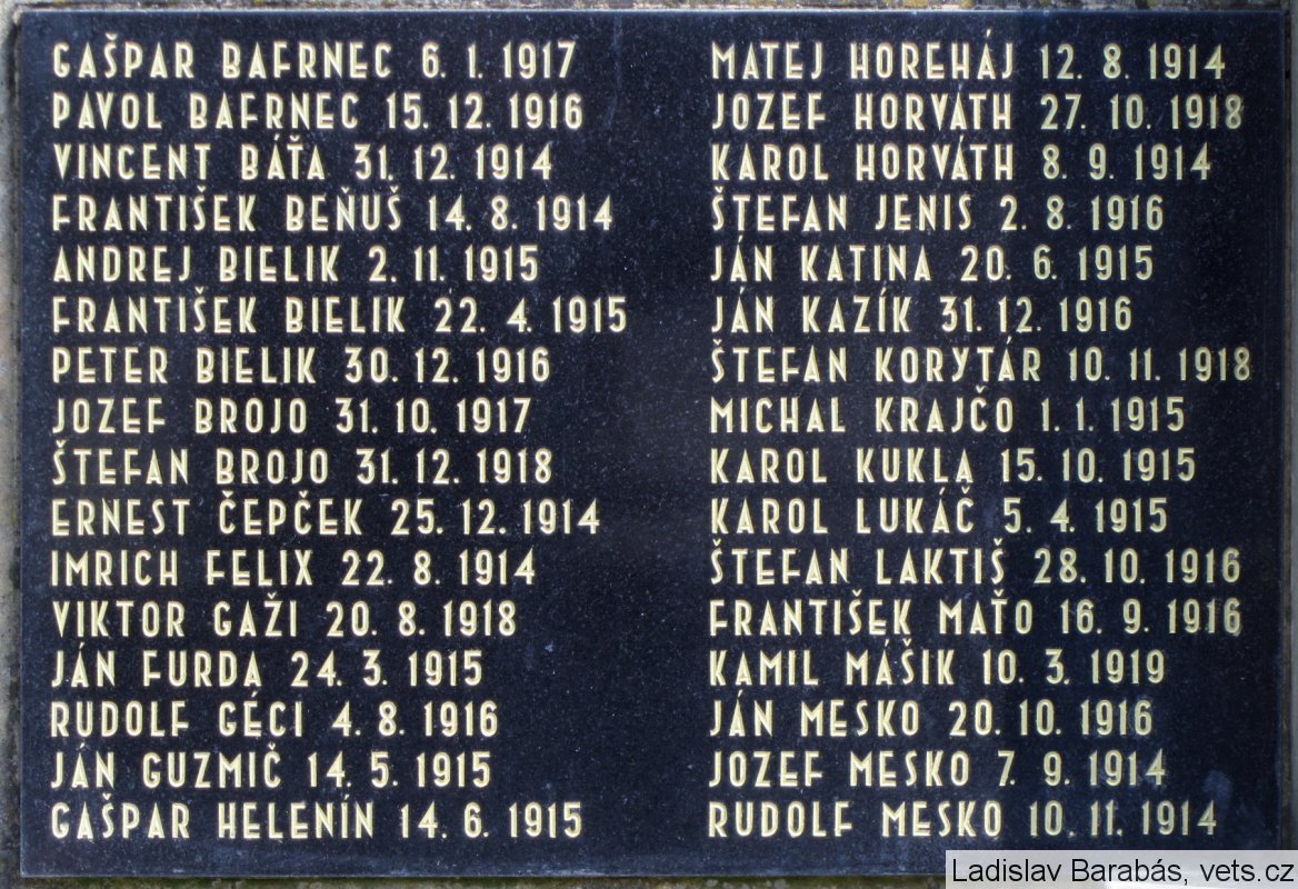 FRANTIŠEK BEŇUŠ 14.8.1914, ANDREJ BIELIK 2.11.1915, FRANTIŠEK BIELIK 22.4.1915, PETER BIELIK 30.12.1916, JOZEF BROJO 31.10.1917, ŠTEFAN BROJO 31.12.1918, ERNEST ČEPČEK 25.12.1914, IMRICH FELIX 22.8.1914, VIKTOR GAŽI 20.8.1918, JÁN FURDA 24.3.1915, RUDOLF GÉCI 4.8.1916, JÁN GUZMIČ 14.15.1915, GAŠPAR HELENÍN 14.6.1915, MATEJ HOREHÁJ 12.8.1914, JOZEF HORVÁTH 27.10.1918, KAROL HORVÁTH 8.9.1914, ŠTEFAN JENIS 2.8.1916, JÁN KATINA 20.6.1915, JÁN KAZÍK 31.12.1916, ŠTEFAN KORYTÁR 10.11.1918, MICHAL KRAJČO 1.1.1915, KAROL KUKLA 15.10.1915, KAROL LUKÁČ 5.4.1915, ŠTEFAN LAKTIŠ 28.10.1916, FRANTIŠEK MAŤO 16.9.1916, KAMIL MÁŠIK 10.3.1919, JÁN MESKO 20.10.1916, JOZEF MESKO 7.9.1914, RUDOLF MESKO 10.11.1914, ŠTEFAN MESKO 28.2.1916, IMRICH OBYCKÝ 5.5.1918, JÁN OROLIN 24.9.1918, MICHAL OROLIN 16.7.1915, ŠTEFAN OROLIN 12.4.1918, ANTON PRIKRYL 5.10.1916, ANTON PULPITEL 15.6.1916, LEOPOLD PULPITEL 18.5.1915, KAROL RAFFAJ 1.11.1914, FRANT. ŠTEVULA 23.9.1916, KAROL ŠTEVULA 25.11.1914, KAROL ŠÚTOR 16.7.1915, ALOJZ ŠURDA 14.3.1916, JOZEF ŠVEC 27.7.1918, JOZEF UHRECKÝ 31.12.1915, JOZEF VALÁŠIK 15.10.1915, PAVOL VLČKO 9.1.1916, IGNÁC ZBONKA 7.3.1915, JOZEF ZOVČIN 26.4.1916, JURAJ KAISER 21.9.1944, JÚLIUS ČERVENÝ 7.10.1944, KAROL DROZDÍK 20.10.1944, JOZEF DROZDÍK 28.3.1945, KAROL ĎURAN 21.9.1944, ERNEST ČEPČEK 6.10.1944, JOZEF FURDA 10.3.1945, JÚLIUS KLAČANSKÝ 2.7.1942, KAROL KONOPA 28.4.1944, ĽUDOVIT LAKTIŠ 6.10.1942, MICHAL PECHO 6.1.1945, RUDOLF SKLIENKA 23.9.1944, JOZEF ŠAFÁR 3.11.1944