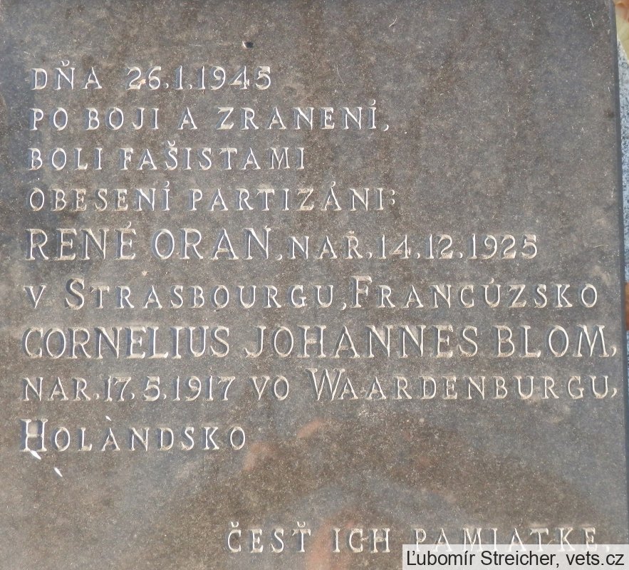 Blom Cornelis Johannis: pocházel z rodiny farmáře. Povoláním řidič. Po incidentu s policistou, kterému rozřezal pneumatiky na kole, byl Němci zatčen. Dostal na výběr - pracovní tábor nebo Nizozemskou dobrovolnickou legii. Tu si vybral a byl poslán do Ruska. Koncem roku 1944 se po ústupu dostal na Slovensko. S dalšími třemi se rozhodl přidat k partyzánům. 25.1.1945 se vrátili do Topolčianek a při shánění jídla se dostali do přestřelky s německou hlídkou. 2 byli zastřeleni a Blom s Oranem, zraněni, uprchli. Další den se však přihlásili Němcům, aby neohrozili rodinu, která jim poskytla pomoc. Následovalo odsouzení s poprava oběšením.
