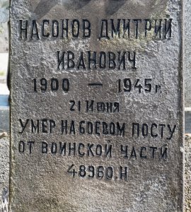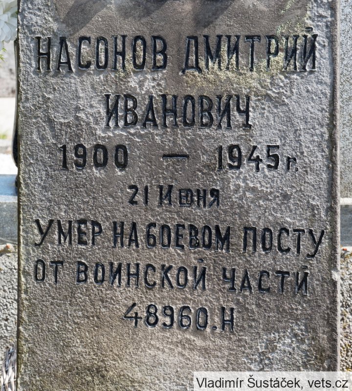 Jedná se o válečný hrob s ostatky. Dmitrij Ivanovič Nasonov podle CEVH zahynul 21. ledna 1945, v textu na náhrobku je uvedeno datum 21. června (to je však nepravděpodobné, protože podle textu zemřel na bojišti).