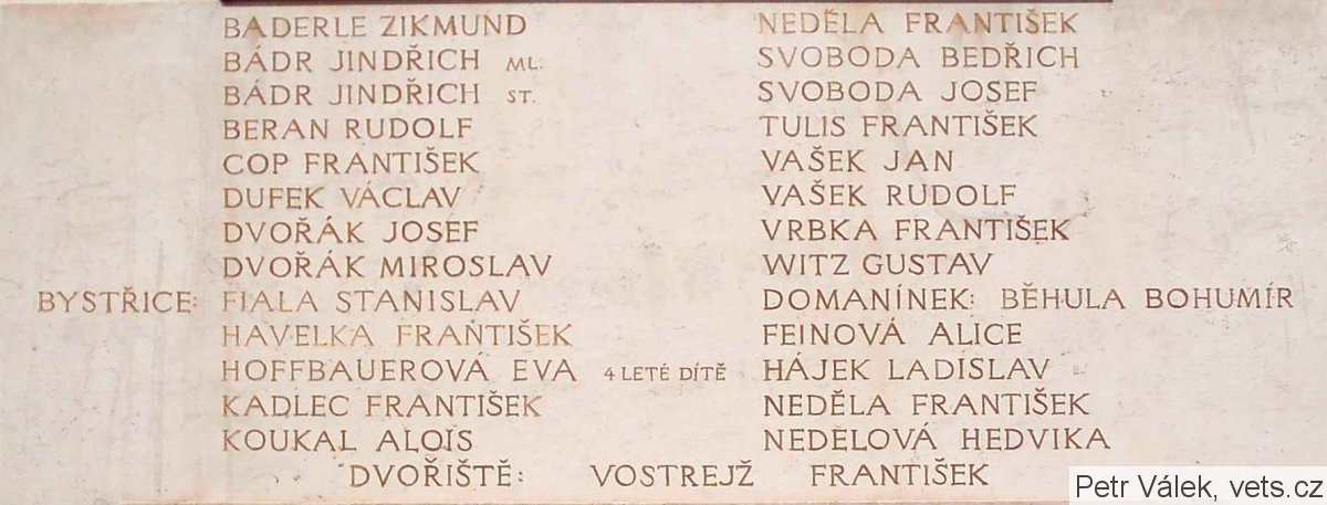 Pamětní desku věnovanou padlým bystřickým občanům vytvořil akademický sochař Karel Racek v roce 1923.