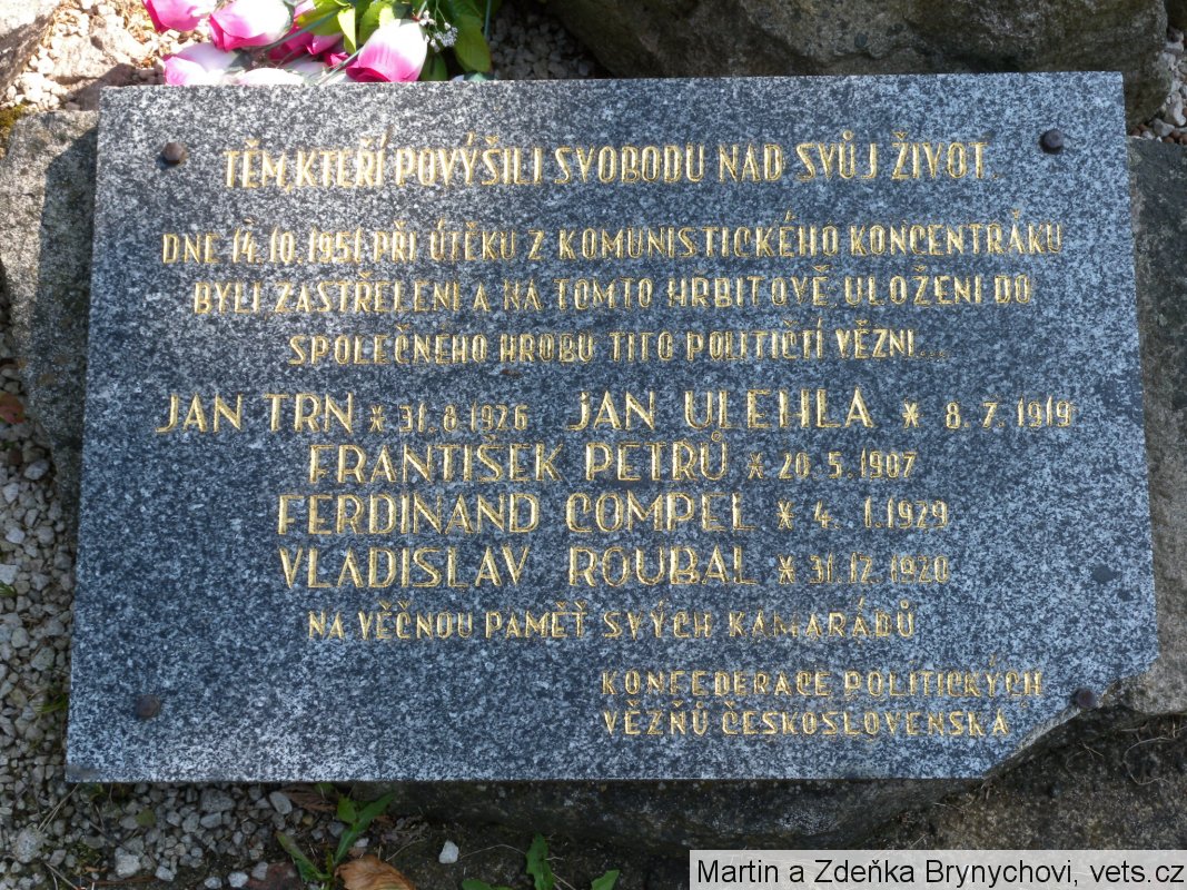 Dne 14.10.1951 při útěku z komunistického koncentráku byli zastřeleni a na tomto hřbitově uloženi do společného hrobu tito političtí vězni