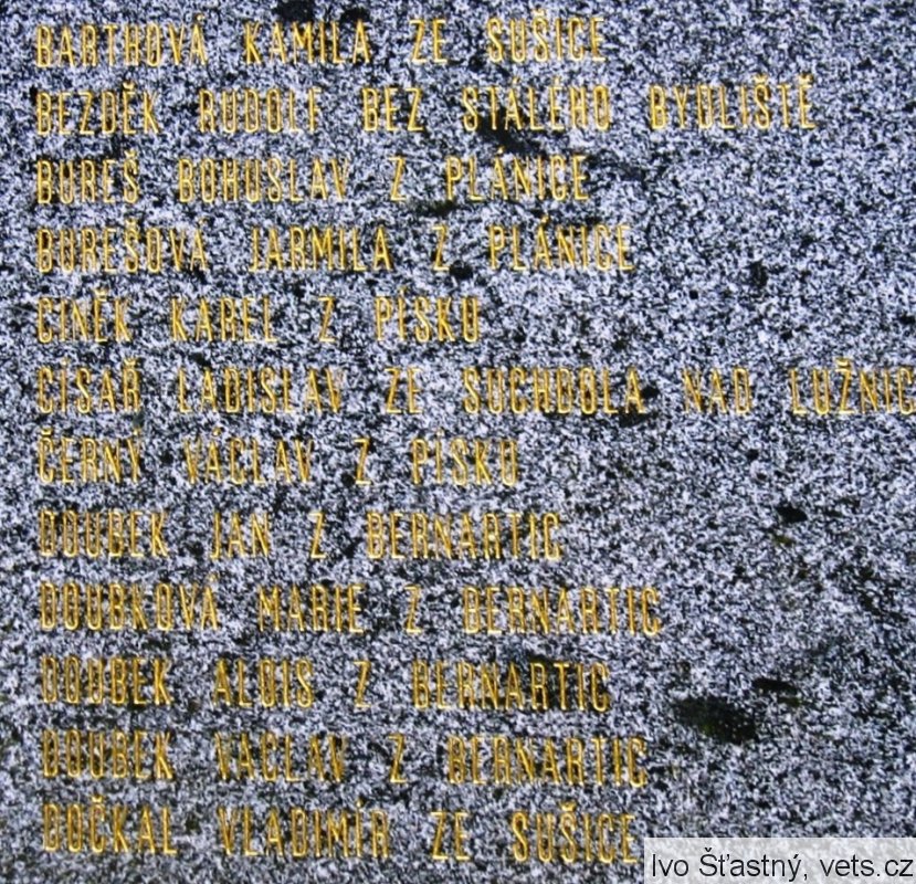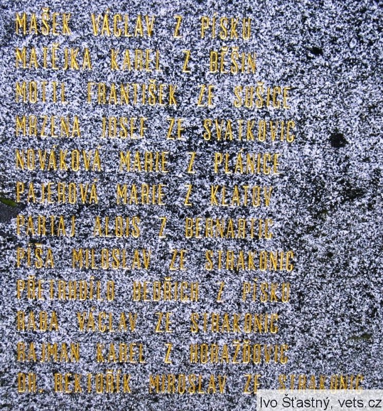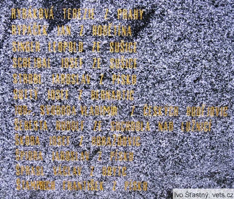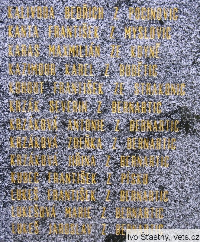BARTHOVÁ KAMILA ZE SUŠICE, BEZDĚK RUDOLF BEZ STÁLÉHO BYDLIŠTĚ, BUREŠ BOHUSLAV Z PLÁNICE, BUREŠOVÁ JARMILA Z PLÁNICE, CINĚK KAREL Z PÍSKU, CÍSAŘ LADISLAV ZE SUCHDOLA NAD LUŽNICÍ, ČERNÝ VÁCLAV Z PÍSKU, DOUBEK JAN Z BERNARTIC, DOUBKOVÁ MARIE Z BERNARTI, DOUBEK ALOIS Z BERNARTIC, DOUBEK VÁCLAV Z BERNARTIC, DOČKAL VLADIMÍR ZE SUŠICE, FABINGER JAROSLAV ZE STRAKONIC, FICTUM FRANTIŠEK Z PUGLIC, FÜRTH KAREL ZE ŽICHOVIC, HALÍŘ JAN Z KLATOV, HANŽLA VOJTĚCH Z BUDÍNĚ U PÍSKU, HEŘMAN JAN ZE SUCHDOLA NAD LUŽNICÍ, HRUBEC FRANTIŠEK Z BERNARTIC, HRUBCOVÁ CECILIE Z BERNARTIC, HRUBEC JAROSLAV Z PRAHY 10, HÜBLBAUER KAREL Z PRAHY 10, HÜBLBAUEROVÁ MARIE Z PRAHY 10, KALIVODA BEDŘICH Z POCINOVIC, KANTA FRANTIŠEK Z MYSLOVIC, KARAS MAXMILIÁN ZE KDYNĚ, KAZIMOUR KAREL Z RADĚTIC, KOHOUT FRANTIŠEK ZE STRAKONIC, KRZÁK SEVERIN Z BERNARTIC, KRZÁKOVÁ ANTONIE Z BERNARTIC, KRZÁKOVÁ ZDEŇKA Z BERNARTIC, KRZÁKOVÁ JIŘINA Z BERNARTIC, KUBEC FRANTIŠEK Z PÍSKU, LUKEŠ FRANTIŠEK Z BERNARTIC, LUKEŠOVÁ MARIE Z BERNARTIC, LUKEŠ JAROSLAV Z BERNARTIC, MAŠEK VÁCLAV Z PÍSKU, MATĚJKA KAREL Z BĚŠIN, MOTTL FRANTIŠEK ZE SUŠICE, MRZENA JOSEF ZE SVATKOVIC, NOVÁKOVÁ MARIE Z PLÁNICE, PAJEROVÁ MARIE Z KLATOV, PARTAJ ALOIS Z BERNARTIC, PÍŠA MILOSLAV ZE STRAKONIC, PŘETRHDÍLO BEDŘICH Z PÍSKU, RABA VÁCLAV ZE STRAKONIC, RAJMAN KAREL Z HORAŽĎOVIC, DR. REKTOŘÍK MIROSLAV ZE STRAKONIC, RYBÁKOVÁ TEREZIE Z PRAHY, RYPÁČEK JAN Z HODĚTÍNA, SINGER LEOPOLD ZE SUŠICE, SCHEJBAL JOSEF ZE SUŠICE, STROBL JAROSLAV Z PÍSKU, SUTTÝ JOSEF Z BERNARTIC, JUDR. SVOBODA VLADIMÍR Z ČESKÝCH BUDĚJOVIC, ŠEBESTA RUDOLF ZE SUCHDOLA NAD LUŽNICÍ, ŠKODA JOSEF Z HORAŽĎOVIC, ŠPIDRA JAROSLAV Z PÍSKU, ŠPRASL VÁCLAV Z OBYTC, ŠTAMPRECH FRANTIŠEK Z PÍSKU, ŠTANGL JAROSLAV Z PÍSKU, ŠTEFLÍČKOVÁ MARIE ZE STRAKONIC, ŠTĚRBÁČEK KLEMENT Z PÍSKU, TOMEK BOHUSLAV Z BERNARTIC, TOMEKOVÁ MARIE Z BERNARTIC, TUPÝ FERDINAND Z BERNARTIC, TUPÁ MARIE Z BERNARTIC, VIKTORA JOSEF Z VĚŠÍNA, VIKTOROVÁ BOŽENA Z VĚŠÍNA, VIKTOROVÁ MARIE Z VĚŠÍNA, VIKTORA JIŘÍ Z VĚŠÍNA, VLK VIKTOR Z PÍSKU.