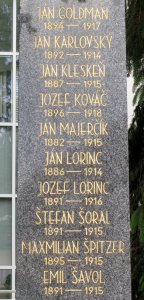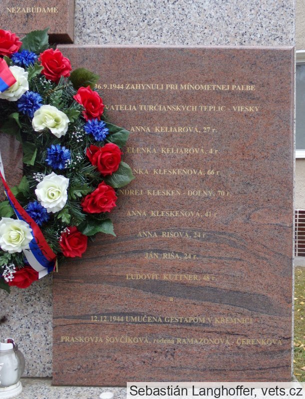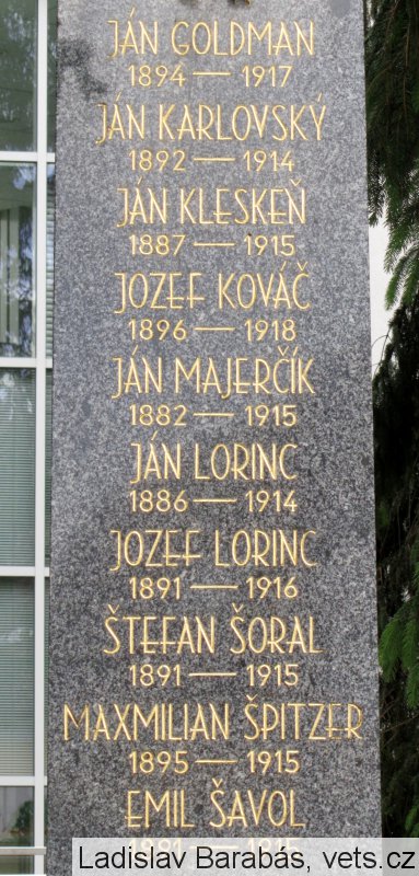 Umístění: Turčianske Teplice, Kollárova, v parčíku pri vyústení Kúpeľnej ulice do KollárovejJÁN GOLDMANN 1894-1917, JÁN KARLOVSKÝ 1892-1914, JÁN KLESKEŇ 1887-1915, JOZEF KOVÁČ 1896-1918, JÁN MAJERČÍK 1882-1915, JÁN LORINC 1886-1914, JOZEF LORINC 1891-1916, ŠTEFAN ŠORAL 1891-1915, MAXIMILIAN ŠPITZER 1895-1915, EMIL ŠAVOL 1891-1915