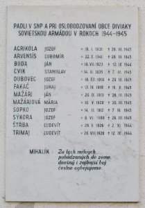 AGRIKOLA JOZEF *18. I. 1931 †26. III. 1945, ARVENSIS ĽUBOMÍR *22. X. 1941 †26. III. 1945, BODA JÁN *19. VII. 1923 †12. IX. 1944, CVIK STANISLAV *14. II. 1935 †7. IV. 1945, DUBOVEC JOZEF *18. XII. 1910 †29. III. 1945, FAKAČ JURAJ *13. IV. 1918 †16. V. 1945, MAŽÁRI JÁN *20. IX. 1913 †26. III. 1945, MAŽÁRIOVÁ MÁRIA *10. V. 1920 †26. III. 1945, SOPKO JOZEF *14. II. 1912 †7. IV. 1945, SÝKORA JOZEF *8. VI. 1908 †26. III. 1945, ŠTRBA ĽUDEVÍT *29. V. 1926 †2. XI. 1944, TRIMAJ ĽUDEVÍT *26. VIII. 1926 †12. IX. 1944