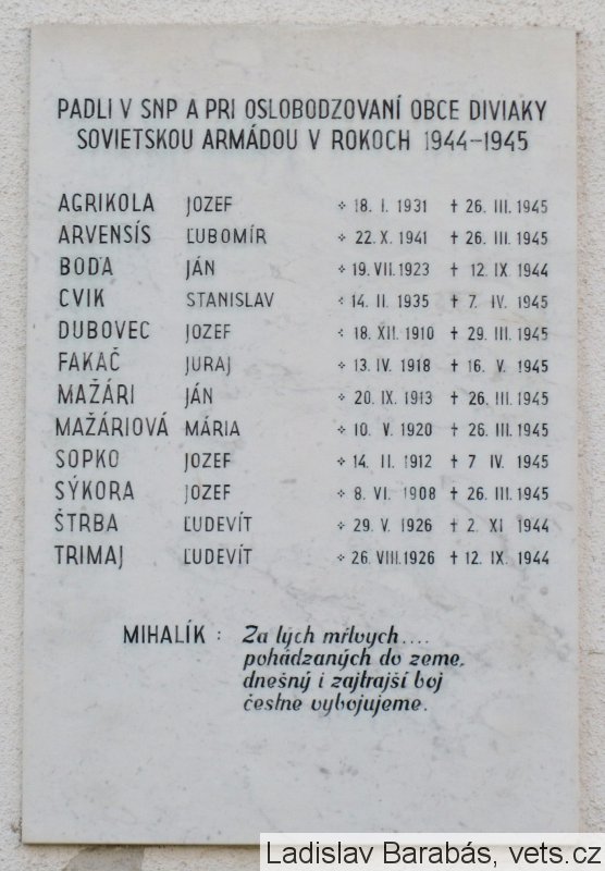 Umístění: Turčianske Teplice, Matičná 12, na budove oproti zvonici v časti DiviakyPADLI V SNP PRI OSLOBODZOVANÍ OBCE DIVIAKY