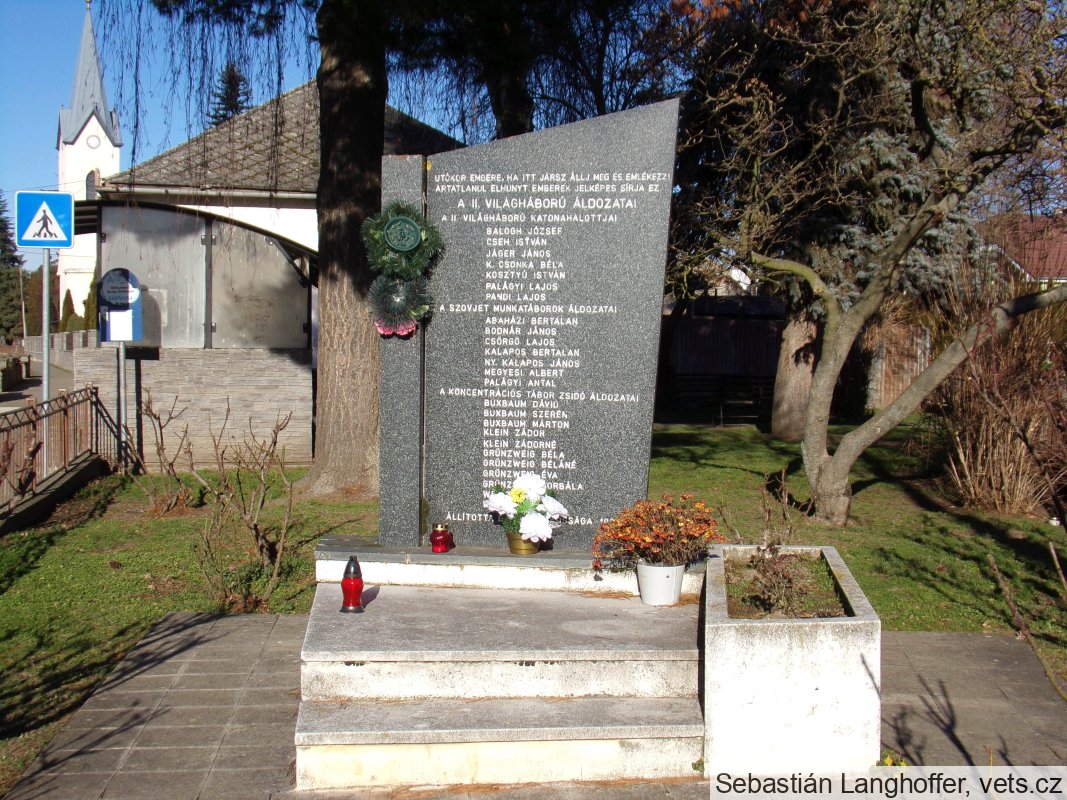 Človek budúcnosti, ak tadiaľto pôjdeš, zastav sa a pamätaj si! Toto je symbolický hrob ľudí, ktorí zomreli následkami 2. svetovej vojny.
