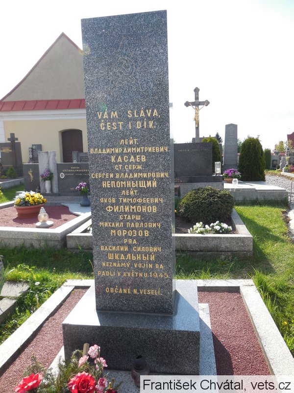 Po osvobození v květnu 1945 bylo Nové Veselí dočasným sídlem vrchního velitelství Smolenské divize. Ve zdejší škole byla zřízena divizní nemocnice pro těžce raněné vojáky. V Novém Veselí byli pohřbeni ti, kteří svým zraněním podlehli. Pomník byl odhalen v roce 1958. (zdroj databáze CEVH MO ČR)