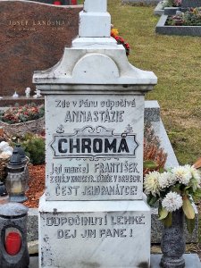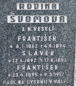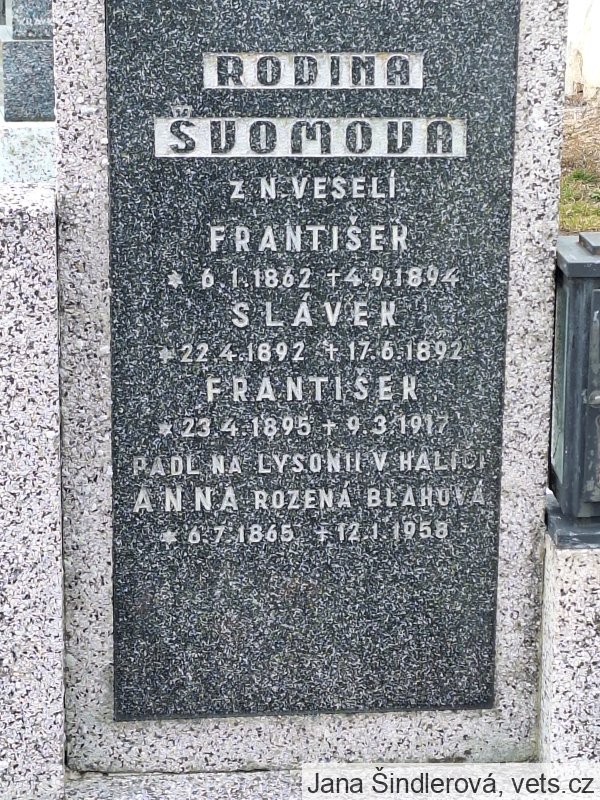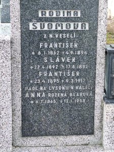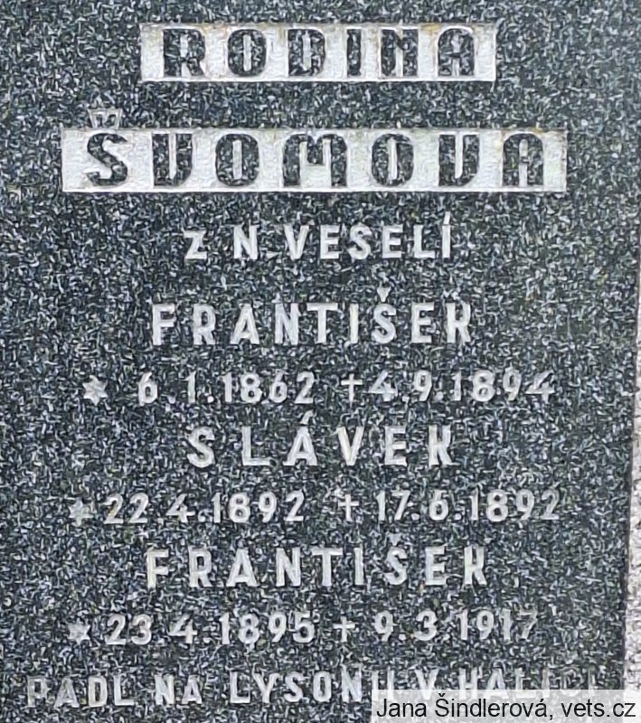 Švoma František, vojín bývalého pěšího pluku 81, nar. 1895 Nové Veselí, Nové Město, Morava, datum a místo úmrtí: 9.3.1917 Lysonia v Haliči, pohřben 9.3.1917 na polním hřbitové Lysonia, opsáno dle matriky býv. p. pluku 81, Brno, tom. 7, fol: 86.