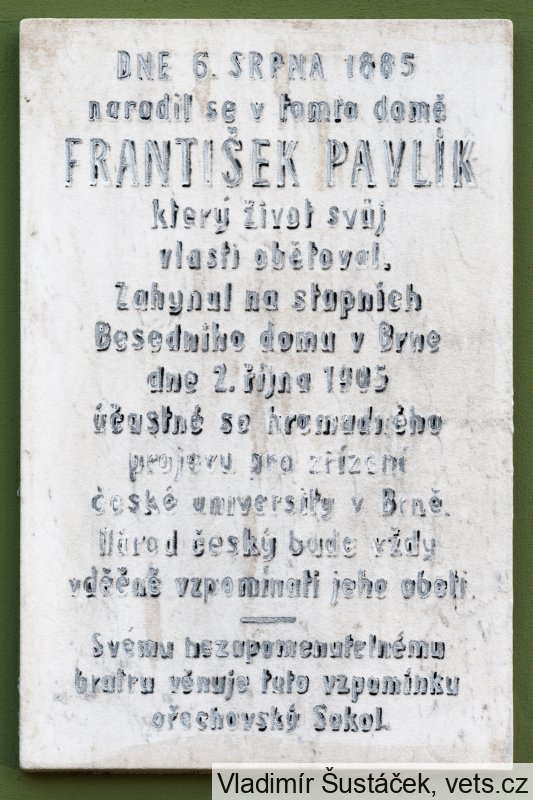 Stolařský dělník František Pavlík z Ořechova byl raněn 1.10.1905 před vchodem do brněnského Besedního domu při manifestaci za zřízení české univerzity v Brně. Během násilných potyček byl probodnut vojákem rakousko-uherské armády, zemřel 2.10. v brněnské zemské nemocnici.