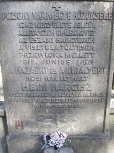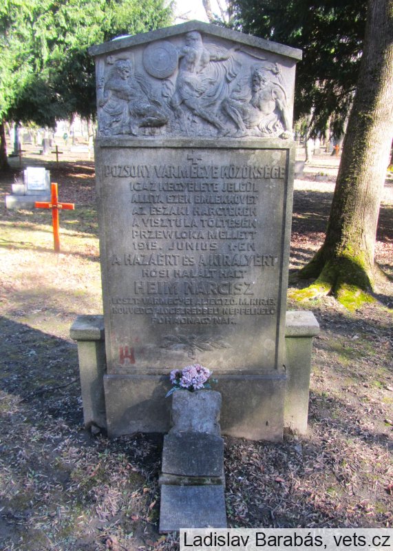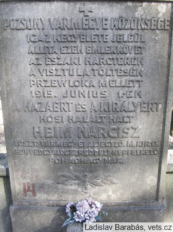 „Verejnosť Bratislavskej župy postavila tento pamätný kameň na znak svojej skutočnej úcty k vlasti a kráľovi, ktorý zomrel hrdinskou smrťou na severnom bojisku, na nábreží Visly, neďaleko Przewloky, 1, júna 1915, za vlasť a kráľa, Nárcisz Heim, župný úradník I. divízie m kir. 13 pešieho pluku Kráľovskej uhorskej armády, povstalecký poručík.“