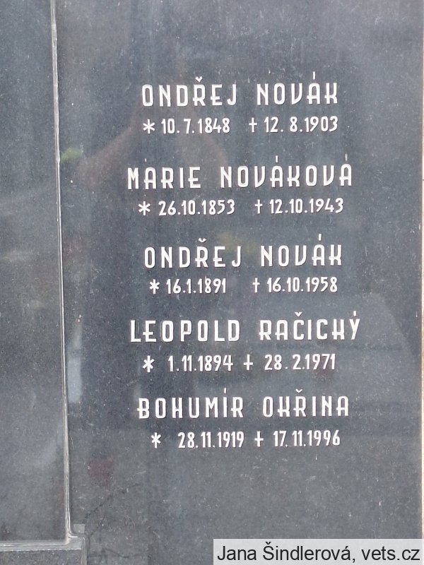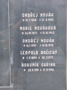 Leopold Lev Račický, nar. 1.11.1891 nebo 1.11.1892, (na pomníku 1.11.1894), Náměšť nad Oslavou, tesařský mistr, stavební příručí, R-U útvar v době zajetí: 81.p. pluk, datum a místo zajetí: 4.9.1915 Tarnopol, datum a místo podání přihlášky: 26.7.1917 Žmerinka, Žitomír, datum zařazení: 18.11.1917, jednotka: 4. stř. pluk (Čs. legie v Rusku), konec v legiích: 30.7.1920 demobilizován, poslední útvar: 2. střelecký pluk, poručík, povolání v letech 1918 - 1968: městský tajemník, legionářská organizace: ČsOL - Náměšť nad Oslavou, číslo průkazu: 38283, 5128.