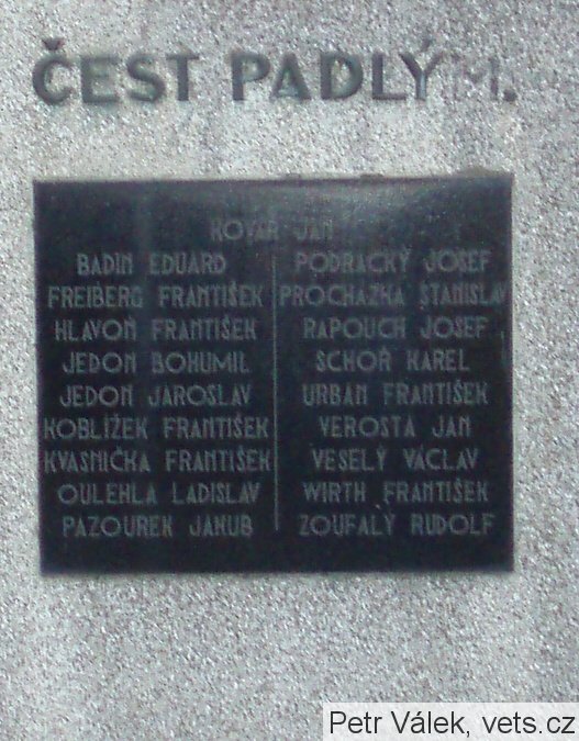 KOVÁŘ JAN, BADIN EDUARD, FREIBERG FRANTIŠEK, HLAVOŇ FRANTIŠEK, JEDON BOHUMIL, JEDON JAROSLAV, KOBLÍŽEK FRANTIŠEK, KVASNIČKA FRANTIŠEK, OULEHLA LADISLAV, PAZOUREK JAKUB, PODRACKÝ JOSEF, PROCHÁZKA STANISLAV, RAPOUCH JOSEF, SCHOŘ KAREL, URBAN FRANTIŠEK, VEROSTA JAN, VESELÝ VÁCLAV, WIRTH FRANTIŠEK, ZOUFALÝ RUDOLF