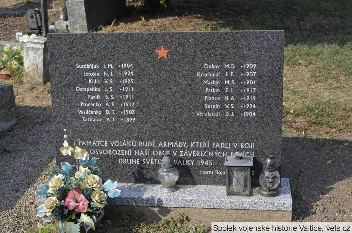 Umístění: Horní Bojanovice, hřbitovBarděňjuk F.M. *1904, Jerošin N.I. *1924, Kuliš V.S. *1925, Ostapeňko J.S. *1911, Pavlik S.S. *1911,