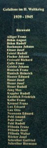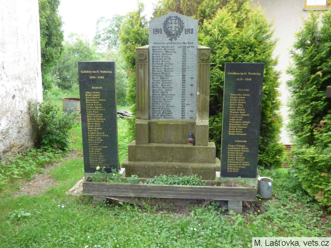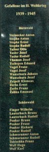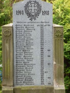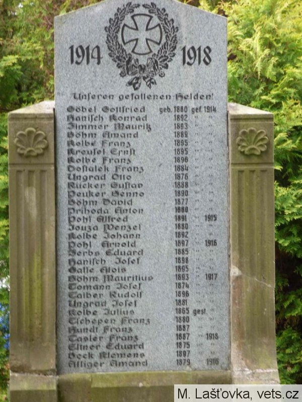 Göbel Gottfried geb. 1880 gef. 1914, Hanisch Konrad 1892, Zimmer Mauritz 1893, Böhm Amand 1889, Kolbe Franz 1895, Kreufel Ernst 1895, Kolbe Franz 1896, Dostalek Franz 1884, Ungrad Otto 1876, Rücker Gustav 1888, Peuker Benno 1890, Böhm David 1877, Prihoda Anton 1880, Pohl Alfred geb. 1891 gef. 1915, Jouza Wenzel 1880, Kolbe Johann 1892, Pohl Arnold geb. 1897 gef. 1916, Zerbs Eduard 1885, Hanisch Josef 1898, Galle Alois 1895, Böhm Maritius geb.1893 gef. 1917, Tomann Josef 1874, Taiber Rudolf 1896, Ungrad Josef 1881, Kolbe Julius geb.1865 gest., Tscheper Franz 1880, Hundt Franz 1887, Tasler Franz geb. 1887 gef. 1918, Eitner Eduard 1875, Beck Klemens 1897, Alliger Amand geb. 1879 geb. 1916