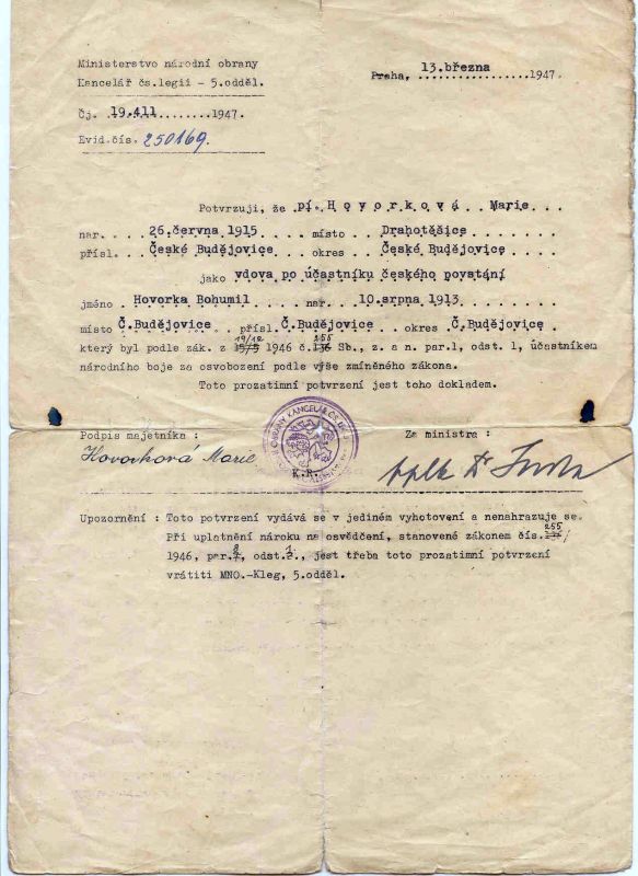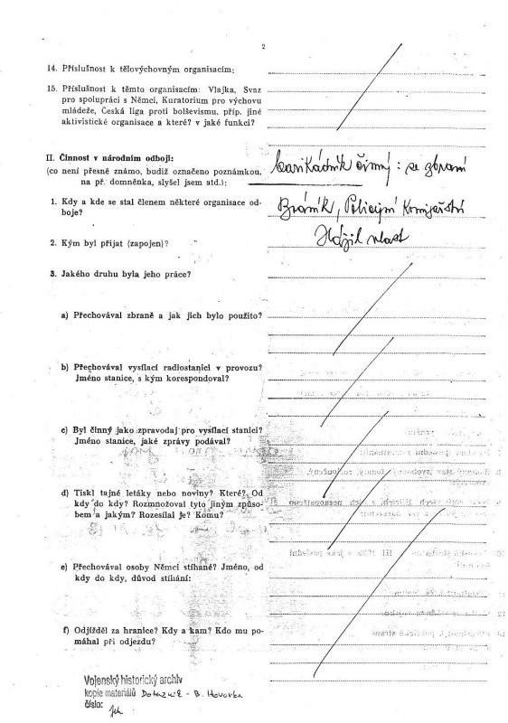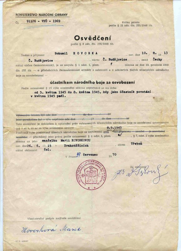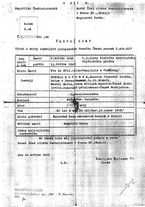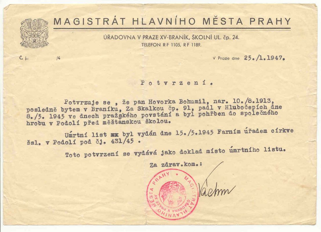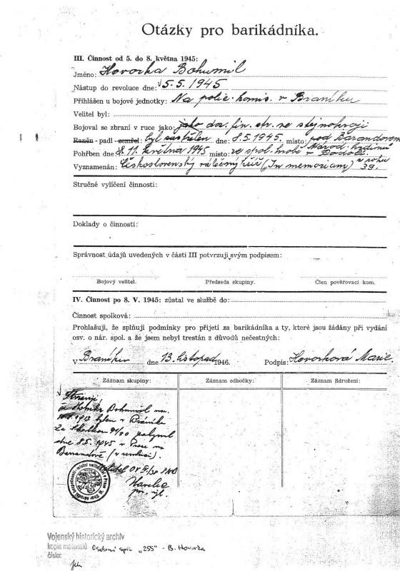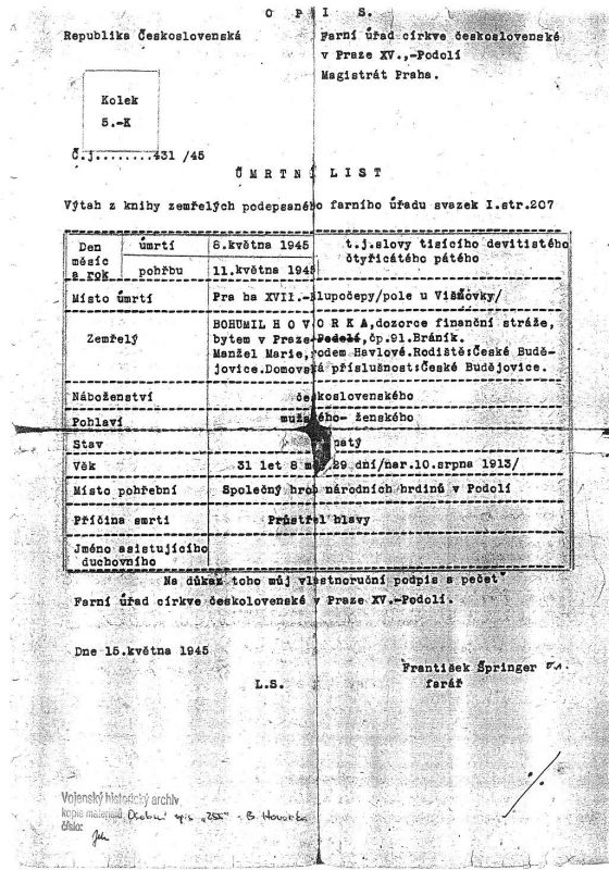 - 5.5.1945 se v uniformě a se zbraní (kterou získal od svého známého) přihlásil na Policejním komisařství v Braníku.