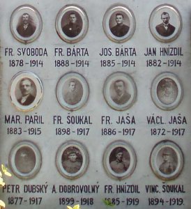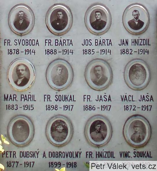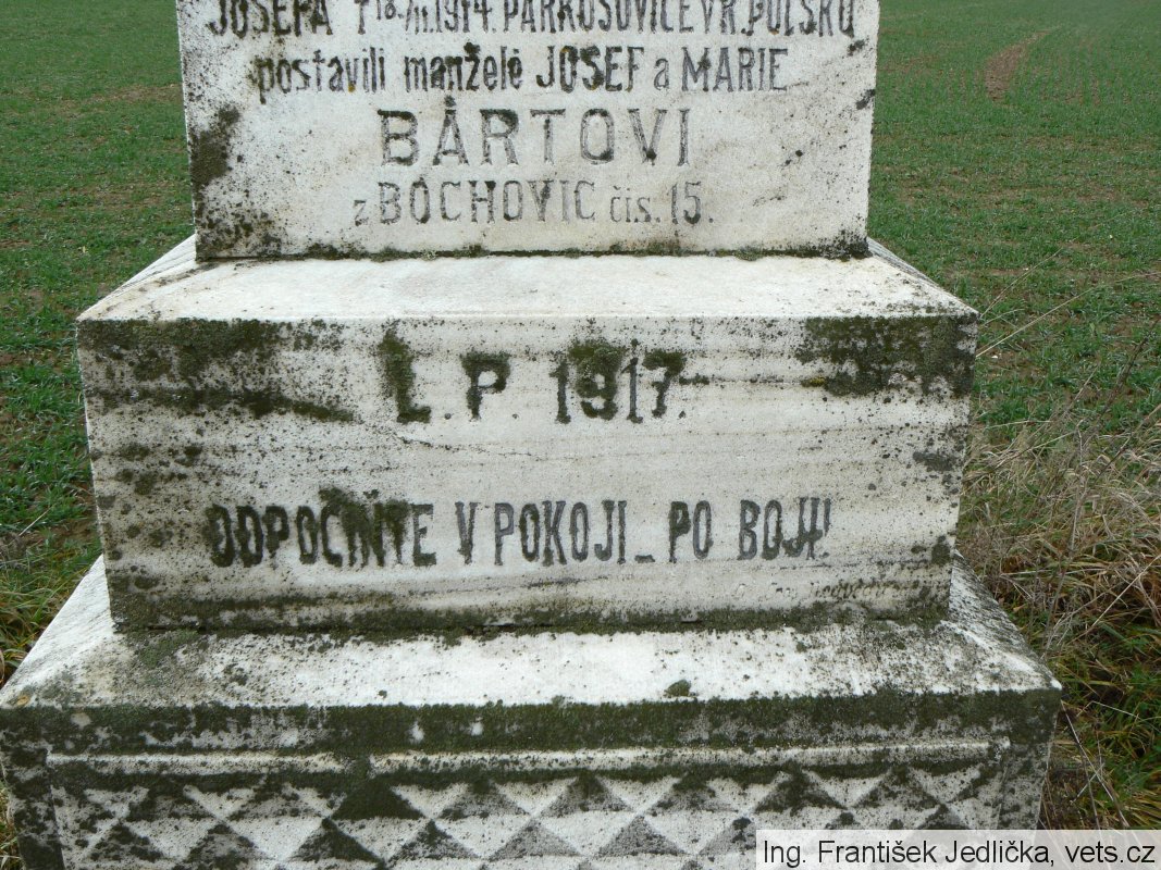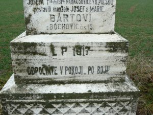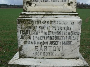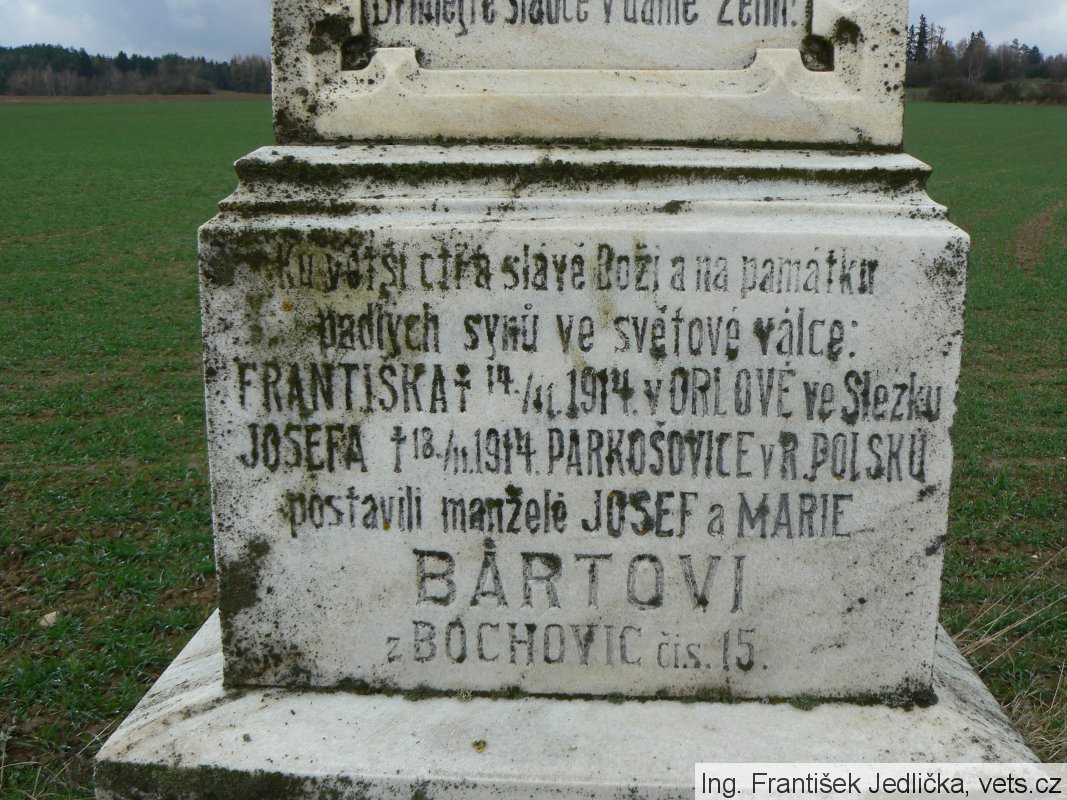 Vojín Josef Bárta, nar. Bochovice 1885, příslušník 81. pěšího pluku. Padl 17.11.1914 u Parkoszowice, Ruské Polsko. Pohřben 17.11.1914 u Parkoszowice.