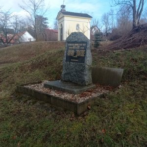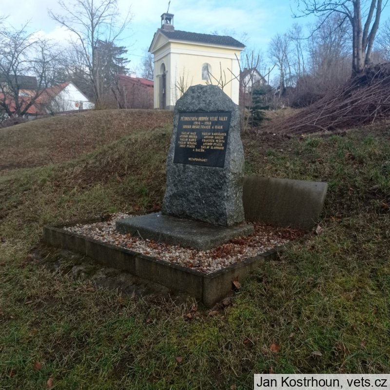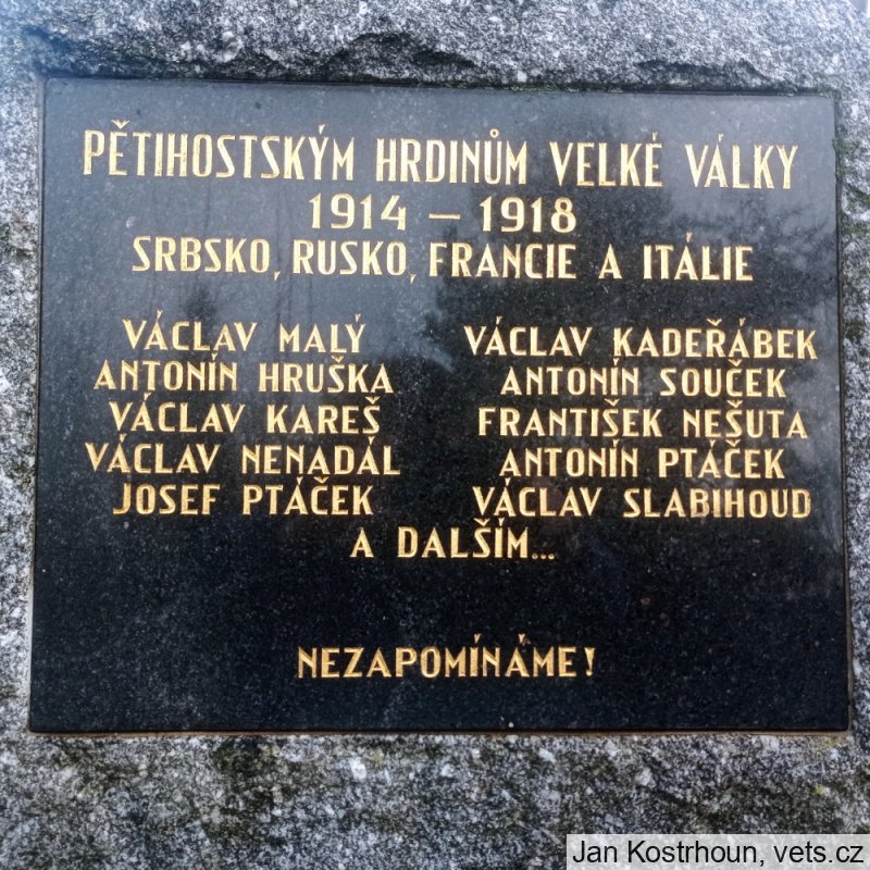 Umístění: Pětihosty, u hlavní silnice procházející obcí ze Senohrab do Pyšel, na svahu pod cestou nedaleko zvoničky (malá náves)Nápis: