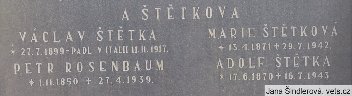Václav Štětka, nar. 1899 Loděnice, okr. Hořovice, svobodný, tkadlec, vojín, pěší pluk č. 88, zemřel 11.11.1917 v Ghertele, Vicenea Itálie, otráven plynem, úmrtní oznámení pěšího pluku č. 88 č.j. 16398 z 1.8.1918.