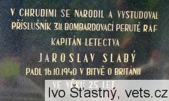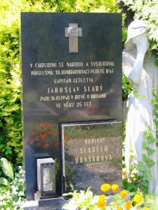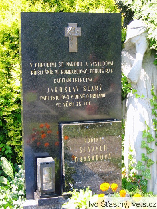 P/O Jaroslav Slabý se narodil 11.4.1915. Jeho poslední let byl bombardérem Wellington MK, IC "KX-H" při náletu na Brémy. Na zpáteční cestě nad Kanálem letoun ztratil radiové spojení. Letoun byl po náletu poškozen protiletadlovou palbou a na severozápad od Londýna narazil do balónové přehrady, kdy mu jedno z lan odřízlo křídlo. Letoun se zřítil 17.10.1940 v 03.22 hodin u Bentley Priory u Stanmore Middlesex. P/O Slabý je spolu s ostatními pohřben ve společném hrobě G.4.17 na hřbitově Pinner Harrow v hrabství Middlesex. (Podle knihy Žít navěky - J. Rail, V. Formánek).