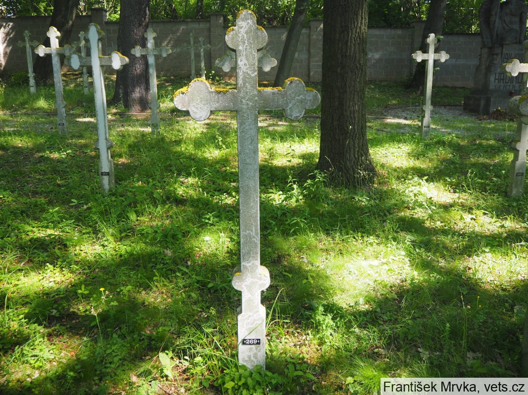 František Šrámek, nar. 1877 Libušín, Bez. Schlan, Čechy, vojín c. k. domobraneckého okresního velitelství č. 8, Praha. Zemřel v místní vojenské nemocnici 11.7.1917 na TBC plic, pohřben do hrobu č. 168.