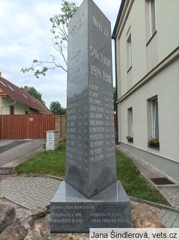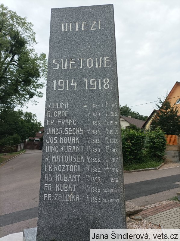 R. HLÍNA * 1.2.1887 + 5.7.1916, R. GROF * 18.8.1889 + 12.8.1916, FR. FRANC * 7.11.1893 + 24.12.1916, JINDŘ. SECKÝ * 30.4.1884 + 12.1.1917, JOS. NOVÁK * 29.3.1888 + 18.1.1917, VINC. KUBANT * 28.6.1880 + 17.6.1917, R. MATOUŠEK * 13.3.1898 + 5.10.1917, FR. ROZTOČIL * 30.7.1882 + 3.11.1918, AD. KUBANT 26.5.1895 – 1918, FR. KUBANT * 21.3.1886 NEZVĚSTNÝ, FR. ZELINKA * 2.12.1893 NEZVĚSTNÝ