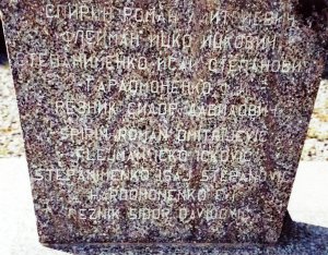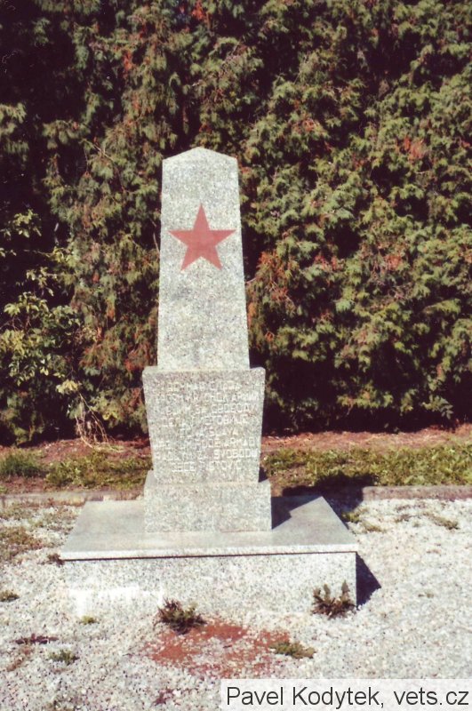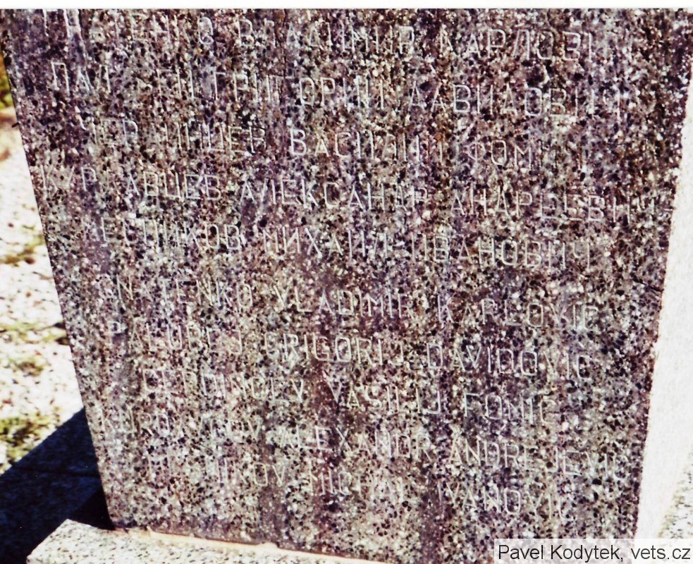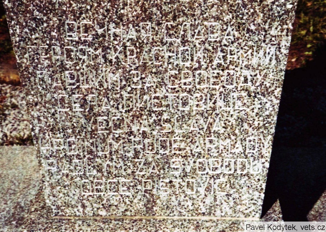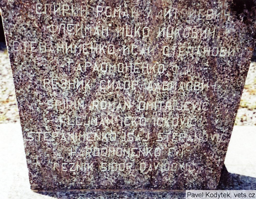 Po obou stranách pomníku jsou jména padlých rudoarmějců (v azbuce, některá jména těžko čitelná).