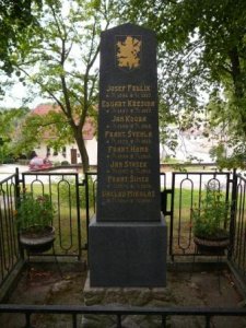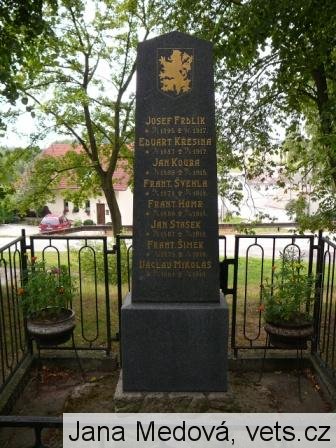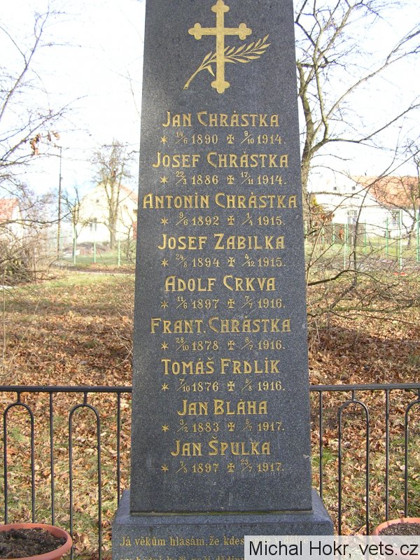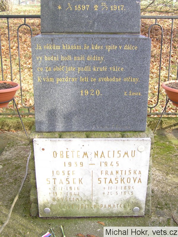 Já věkům hlásám, že kdes spíte v dálce vy hodní hoši naší dědiny, co za oběť jste padli kruté válce. K vám pozdrav letí ze svobodné otčiny. 1920 E. Šimek