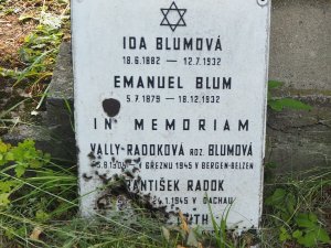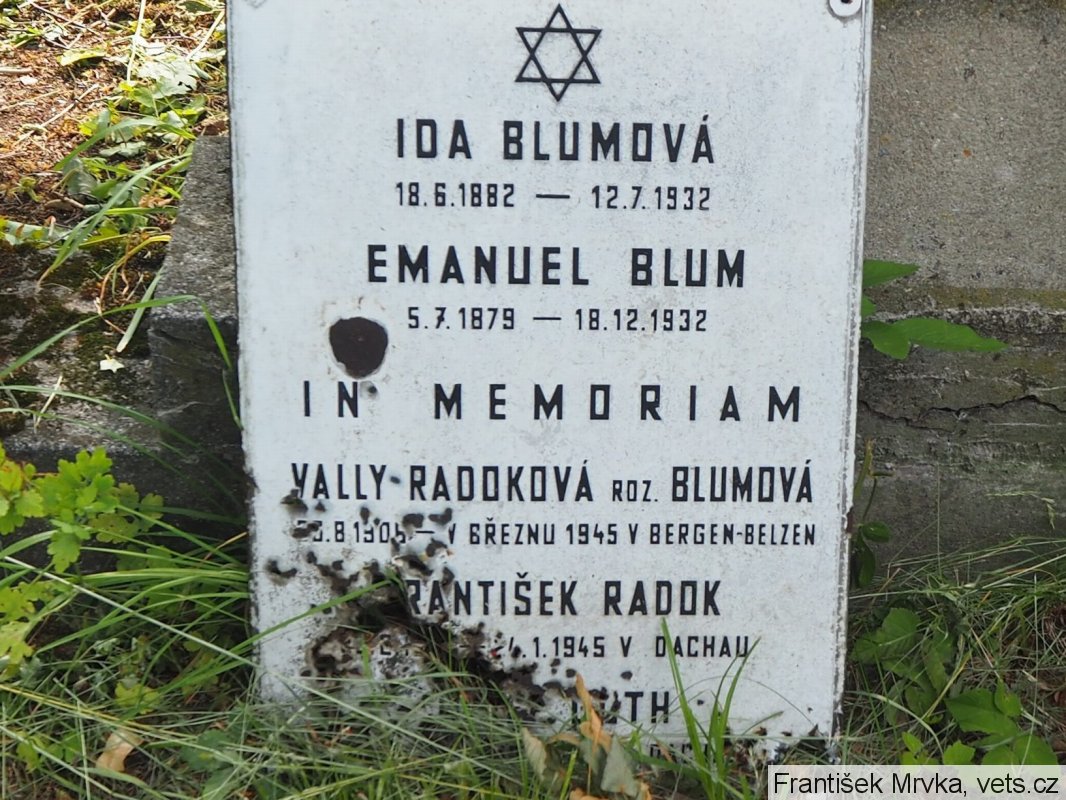 a Valy Radoková, rozená Wally Blumová, narozena 26. 08. 1908, České Budějovice. Poslední bydliště před deportací: Praha I. Adresa/místo registrace v Protektorátu: Praha II, Na Zbořenci 14. Transport De, č. 270 (05. 07. 1943, Praha -> Terezín). Transport Em, č. 1343 (01. 10. 1944, Terezín -> Osvětim)