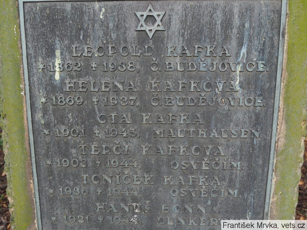Kafka Otto: *5.1.1901 České Budějovice. Bydliště Plzeň, Sedláčkova ulice. Obchodní zástupce, po okupaci pomocný dělník v zemědělství. Transport S, č. 535 (22.1.1942 Plzeň - Terezín). Transport Ds, č. 901 (18.12.1943 Terezín - Osvětim). Zde patrně zahynul. Na kenotafu údaj Mauthausen.