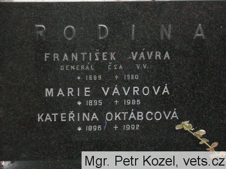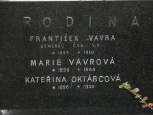 František Vávra (1889 - 1980). Vysoký důstojník českoslovencké armády, rodák ze Straňan na Českobudějovicku. Původně byl poštovním úředníkem, ale za války se přidal do ruských legií. Po válce přišla na řadu vojenská kariéra: působil v Praze, na Slovensku a v Č. Budějovicích. V letech 1934-1937 velel zdejšímu pěšímu pluku 1. Za okupace odešel do ústraní na statek v Nedabyli, zapojil se do Obrany národa. V květnu 1945 již jako velitel obnovené 5. divize inicioval setkání amerických a ruských generálů v Kamenném Újezdě 11.5.1945. Po roce 1945 se vrátil do služby, v roce 1948 však byl dán do výslužby. (Srv. Kovář, Hřbitovy, s. 75)