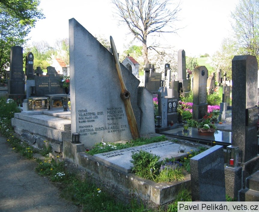 "Na husineckém hřbitově, po pravé straně hlavní cesty přímo u kraje je hrob, který upoutá zvláštním označením. Na kolmé desce šikmo sražené je umístěna vrtule vojenského letadla. Text na desce nás seznámí s husineckými rodáky, kteří jsou zde pochováni: dva bratři Rysové, oba letci, kteří tragicky zahynuli v roce největšího ohrožení naší první republiky.