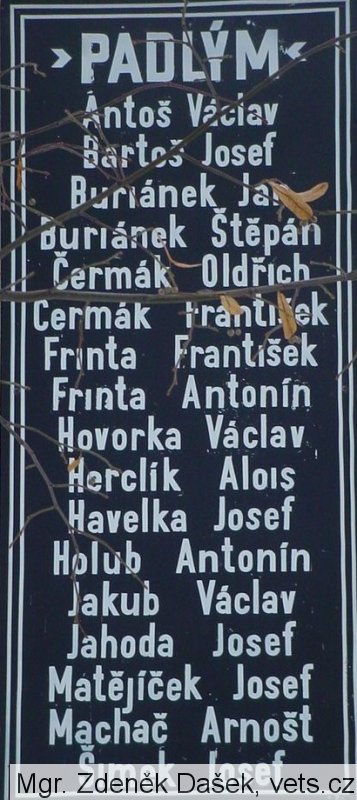 ANTOŠ VÁCLAV, BARTOŠ JOSEF, BURIÁNEK JAR., BURIÁNEK ŠTĚPÁN, ČERMÁK OLDŘICH, ČERMÁK FRANTIŠEK, FRINTA FRANTIŠEK, FRINTA ANTONÍN, HOVORKA VÁCLAV, HERCLÍK ALOIS, HAVELKA JOSEF, HOLUB ANTONÍN, JAKUB VÁCLAV, JAHODA JOSEF, MATĚJÍČEK JOSEF, MACHAČ ARNOŠT, ŠIMEK JOSEF