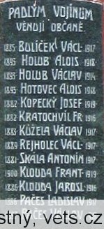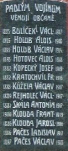 BULÍČEK VÁCL. 1885 – 1917, HOLUB ALOIS 1893 – 1918, HOLUB VÁCLAV 1893 – 1914, HOTOVEC ALOIS 1893 – 1918, KOPECKÝ JOSEF 1882 – 1919, KRATOCHVÍL FR. 1882 – 1916, KŮŽELA VÁCLAV 1883 – 1917, REJHOLEC VÁCL. 1889 – 1917, SKÁLA ANTONÍN 1881 – 1917, KLOUDA FRANT. 1900 – 1919, KLOUDA JAROSL. 1886 - 1916, PAČES LADISLAV 1896 – 1917, PAČES VÁCLAV 1897 – 1918