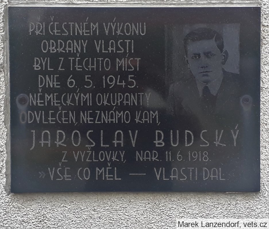 Jaroslav Budský byl v neděli 6. 5. 1945 při příjezdu na kole od Kozojed zatčen na Vyžlovce u rybníčku německou vojenskou hlídkou pro držení zbraně - pistole a odvezen do hotelu Wágner v Jevanech a poté do školy v Kostelci nad Černými lesy, kde byla vojenská posádka. Zde byl uvězněn ve sklepě u jídelny spolu se zadrženými občany z Vyžlovky a Kostelce, kteří ho viděli naposled před svým propuštěním (Jiří Srb).