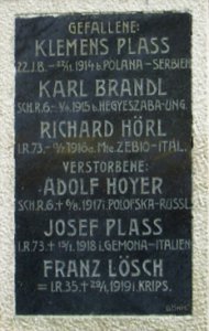 Po levé straně u hlavního vchodu do kostela svatého Martina příléhá ke kostelní zdi objekt - památník padlým v 1.světové válce (pozemek p.č.7). Pískovcový objekt je obdélníkového tvaru (cca 180x90cm), členění připomíná menší pískovcové opracované kameny jakoby postupně naskládané na sebe. V horní části je vytesán vojenský kříž umístěný ve věnci ovinutém stuhou. Ve středu objektu je původní černá deska s uvedením jmen, data a místa padlých a válečnými útrapami zemřelých místních mužů. Pod deskou jsou vytesány dva zkřížené tesáky, pod nimiž se nachází taktéž vytesaný nápis: Gewidmet von der Kripser Bevölkerung 1923; über Am Heimkehrer; ihren dem Weltkriege 1914 – 1918 z. Opfer