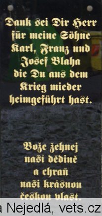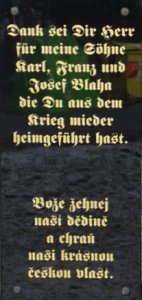 překlad: Děkuji Ti Pane za moje syny Karla, Franze a Josefa Plaha, které jsi mi z války domů vrátil.