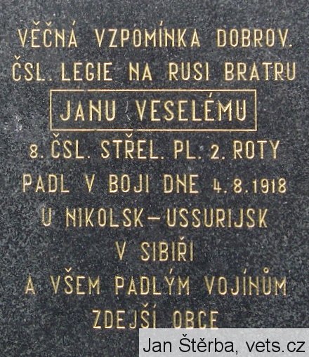 Veselý Jan, narozen 11.6.1896, Cejl. Do ČS legií v Rusku zařazen 16.7.1917, sloužil u 8. střeleckého pluku. (další údaje v databázi VÚA Praha nejsou uvedeny)