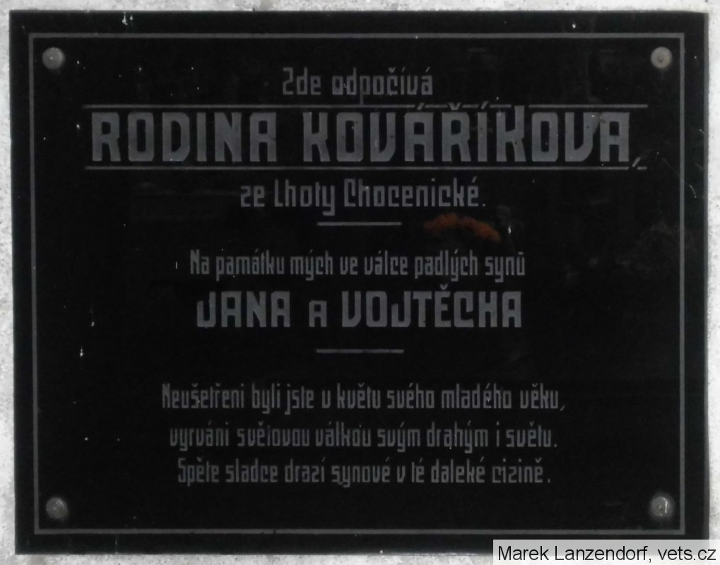 Kovařík Vojtěch: *1885, IR. Nr. 35, zemřel 9.11.1915 St. Maria - Tolmein, Itálie.