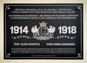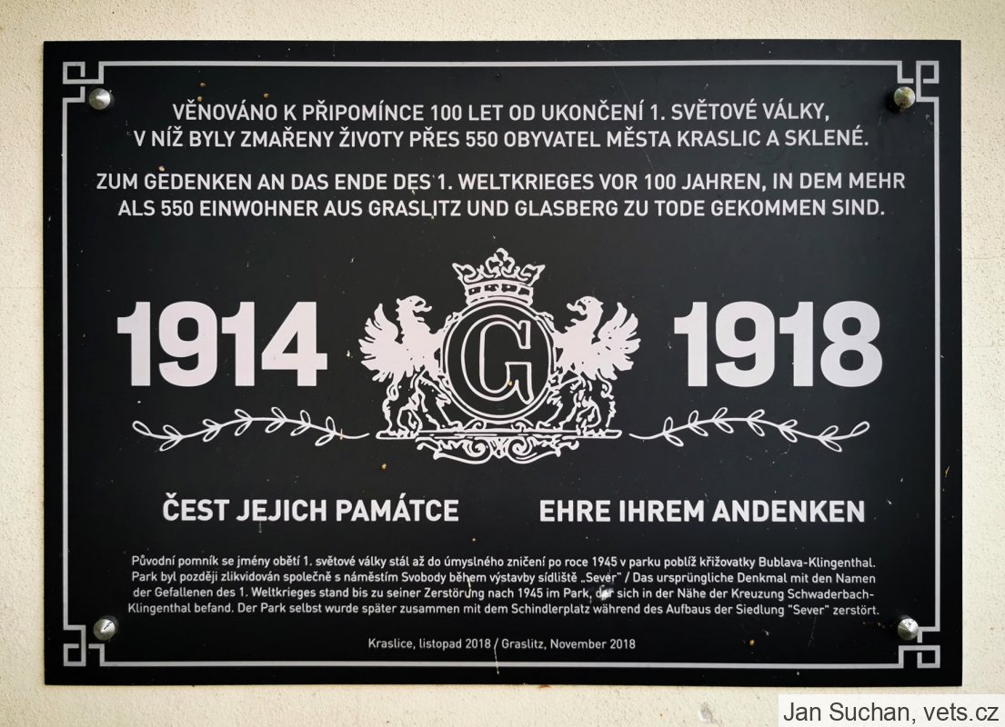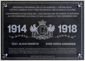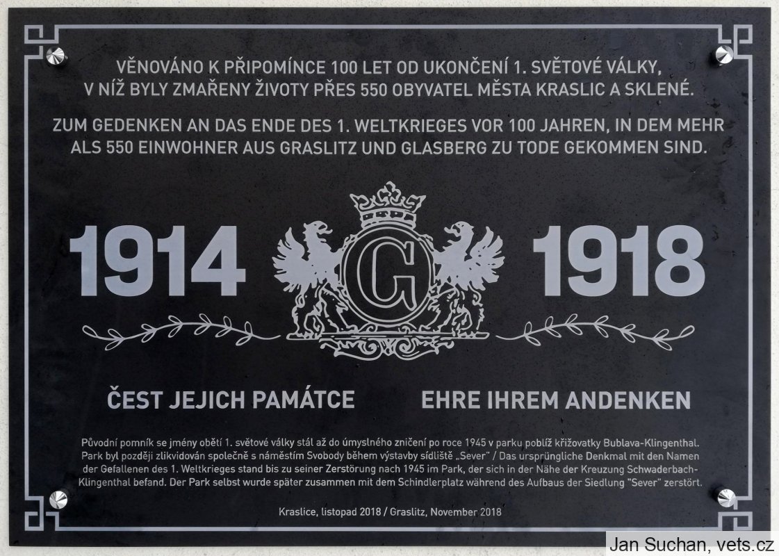 der Gefallenen des 1. Weltkrieges stand bis zu seiner Zerstörung nach 1945 in Park der sich in der Nḧe Kreuzung Schwaderbach - Klingenthal befand. Der Park selbst wurde später zusammen mit dem Schindlerplatz während des Aufbaus der Siedlung "Sever" zerstört.