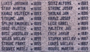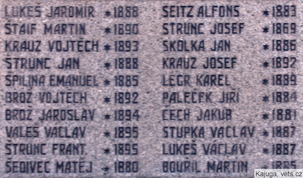 LUKEŠ JAROMÍR *1888, ŠTAIF MARTIN *1890, KRAUZ VOJTĚCH *1893, ŠTRUNC JAN *1888, ŠPILINA EMANUEL *1885, BROŽ VOJTĚCH *1892, BROŽ JAROSLAV *1894, VALEŠ VÁCLAV *1895, ŠTRUNC FRANTIEK *1895, ŠEDIVEC MATĚJ *1880, SEITZ ALFONS *1883, STRUNC JOSEF *1869, SKOLKA JAN *1886, KRAUZ JOSEF *1892, LEGR KAREL *1889, PALEČEK JIŘÍ *1884, ČECH JAKUB *1881, STUPKA VÁCLAV *1887, LUKEŠ , VÁCLAV *1887, BOUŘIL MARTIN *1885