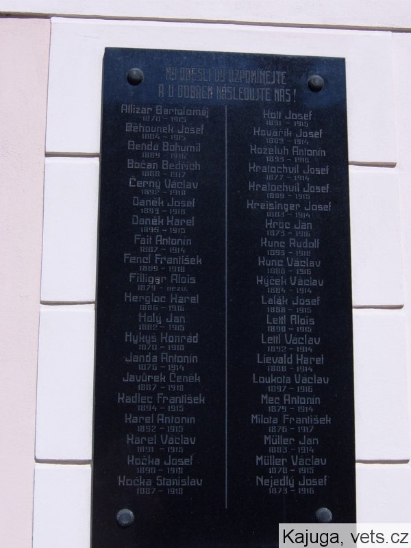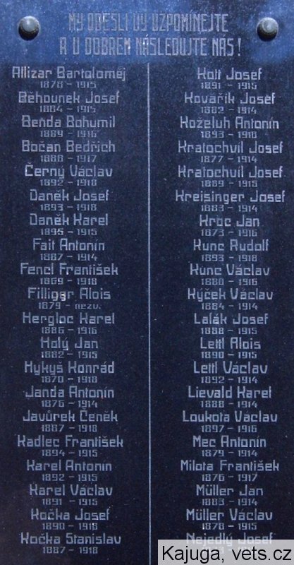 Allizar Bartoloměj 1878-1915, Běhounek Josef 1884-1915, Benda Bohumil 1889-1916, Bočan Bedřich 1888-1917, Černý Václav 1892-1918, Daněk Josef 1893-1918, Daněk Karel 1895-1916, Fait Antonín 1887-1914, Fencl František 1869-1914, Dillingr Alois 1879-nezv., Hergloc Karel 1886-1916, Holý Jan 1882-1915, Hykyš Konrád 1870-1915, Janda Antonín 1876-1914, Javůrek Čeněk 1887-1918, Kadlec František 1894-1915, Karel Antonín 1892-1915, Karel Václav 1891-1915, Kočka Josef 1890-1918, Kočka Stanislav 1887-1918, Kott Josef 1891-1915, Kovářík Josef 1882-1914, Koželuh Antonín 1893-1918, Kratochvíl Josef 1877-1914, Kratochvíl Josef 1889-1915, Kreisinger Josef 1883-1914, Kroc Jan 1873-1916, Kunc Rudolf 1893-1918, Kunc Václav 1880-1916, Kýček Václav 1884-1914, Lalák Josef 1888-1914, Lettl Alois 1890-1915, Lettl Václav 1892-1914, Lievald Karel 1888-1914, Loukota Václav 1897-1916, Mec Antonín 1879-1914, Milota František 1876-1917, Muller Jan 1883-1914, Muller Václav 1878-1915, Nejedlý Josef 1873-1916