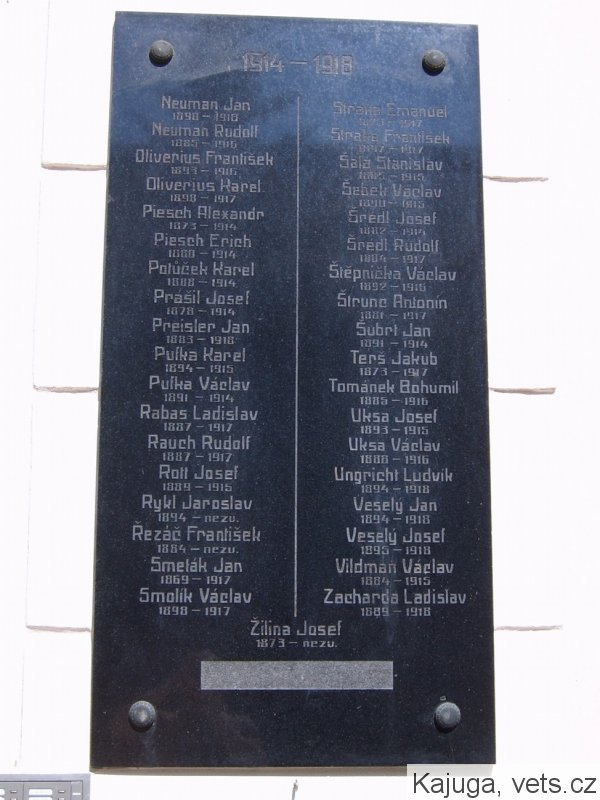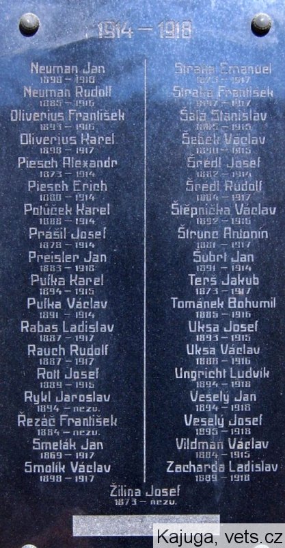 Neuman Jan 1890-1918, Neuman Rudolf 1885-1916, Oliverius František 1893-1916, Oliverius Karel 1898-1917, Piesch Alexandr 1873-1914, Piesch Erich 1880-1914, Polůček Karel 1888-1914, Prášil Josef 1878-1914, Preisler Jan 1883-1918, Pufka Karel 1894-1915, Pufka Václav 1891-1914, Rabas Ladislav 1887-1917, Rauch Rudolf 1887-1917, Rotl Josef 1889-1915, Rykl Jaroslav 1894-nezv., Řezáč František 1884-nezv., Smeták Jan 1869-1917, Smolík Václav 1898-1917, Straka Emanuel 1876-1917, Straka František 1897-1917, Šála Stanislav 1885-1915, Šebek Václav 1890-1915, Šrédl Josef 1882-1914, Šrédl Rudolf 1884-1917, Štěpnička Václav 1892-1916, Štrumc Antonín 1881-1917, Šubrt Jan 1891-1914, Terš Jakub 1873-1917, Tománek Bohumil 1885-1916, Uksa Josef 1893-1915, Uksa Václav 1888-1916, Ungricht Ludvík 1894-1918, Veselý Jan 1894-1918, Veselý Josef 1895-1918, Vildman Václav 1884-1915, Zacharda Ladislav 1889-1918, Žilina Josef 1873-nezv.