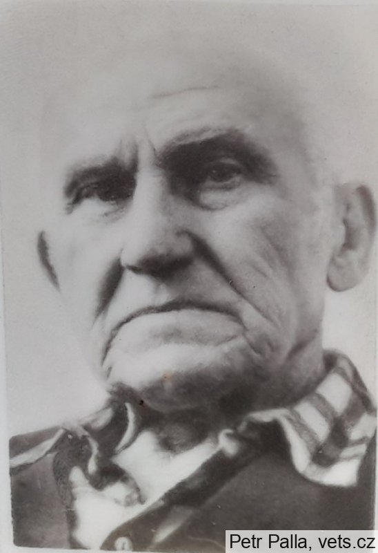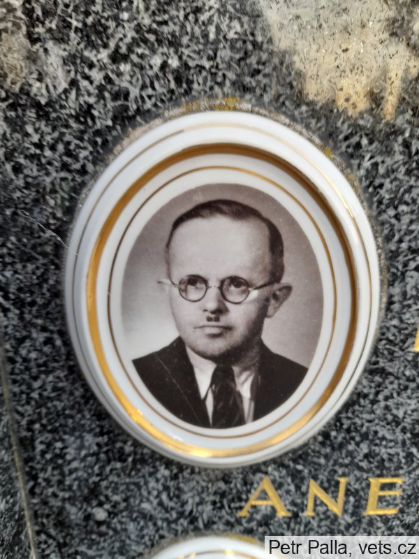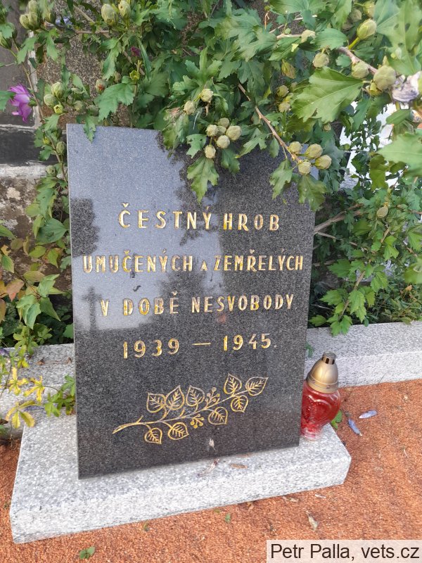 příčina úmrtí: následek zranění po zasažení střepinou z granátu, když vyšel před svůj dům, uveden na pomníku před hřbitovem